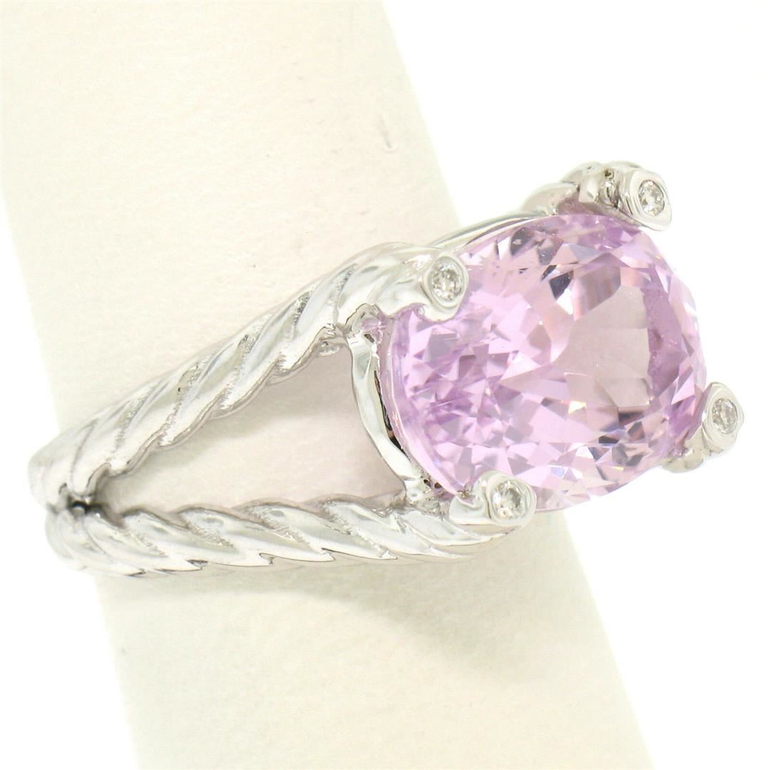 One 14k White Gold Twisted Cable 8.5ct Oval Kunzite Solitaire Ring 4 Burnish Diamond Accents. Item Details: Material: 14k Solid White Gold, Weight: 8.4 Grams, Stone(s): (1) Natural Genuine Kunzite - Oval Cut - Prong Set - Rich, Vivid Pink Color - 8.50ct (approx.), (4) Natural Genuine Diamonds - Round Brilliant Cut - Burnish Set - VS2 Clarity - G Color - 0.06ctw (approx.), Total Carat Weight: 8.56 (approx.), Ring Size: 5.75 (We can custom size this ring.), Ring Width: 11.66mm, Ring Height: 8.99mm rise off the finger, Condition: Like New!
