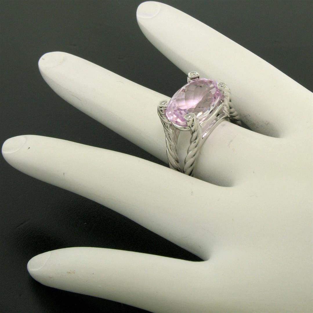 One 14k White Gold Twisted Cable 8.5ct Oval Kunzite Solitaire Ring 4 Burnish Diamond Accents. Item Details: Material: 14k Solid White Gold, Weight: 8.4 Grams, Stone(s): (1) Natural Genuine Kunzite - Oval Cut - Prong Set - Rich, Vivid Pink Color - 8.50ct (approx.), (4) Natural Genuine Diamonds - Round Brilliant Cut - Burnish Set - VS2 Clarity - G Color - 0.06ctw (approx.), Total Carat Weight: 8.56 (approx.), Ring Size: 5.75 (We can custom size this ring.), Ring Width: 11.66mm, Ring Height: 8.99mm rise off the finger, Condition: Like New!