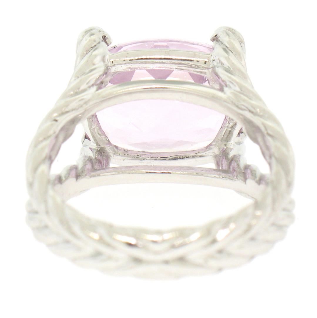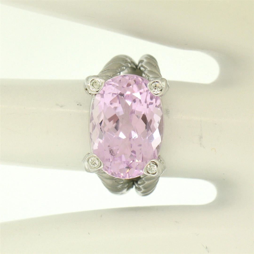 One 14k White Gold Twisted Cable 8.5ct Oval Kunzite Solitaire Ring 4 Burnish Diamond Accents. Item Details: Material: 14k Solid White Gold, Weight: 8.4 Grams, Stone(s): (1) Natural Genuine Kunzite - Oval Cut - Prong Set - Rich, Vivid Pink Color - 8.50ct (approx.), (4) Natural Genuine Diamonds - Round Brilliant Cut - Burnish Set - VS2 Clarity - G Color - 0.06ctw (approx.), Total Carat Weight: 8.56 (approx.), Ring Size: 5.75 (We can custom size this ring.), Ring Width: 11.66mm, Ring Height: 8.99mm rise off the finger, Condition: Like New!