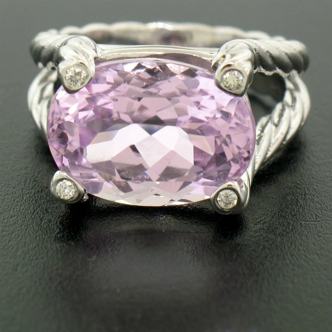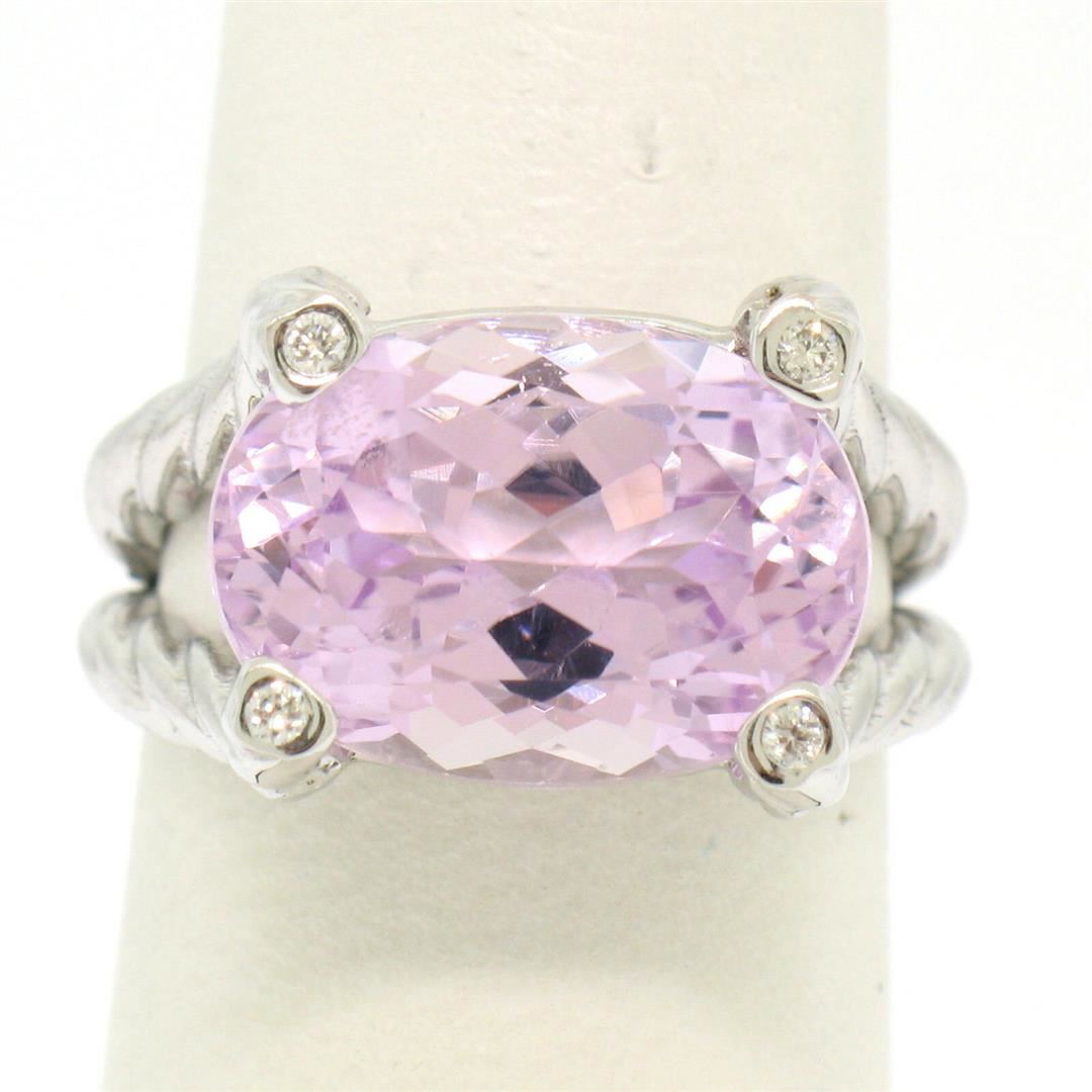 One 14k White Gold Twisted Cable 8.5ct Oval Kunzite Solitaire Ring 4 Burnish Diamond Accents. Item Details: Material: 14k Solid White Gold, Weight: 8.4 Grams, Stone(s): (1) Natural Genuine Kunzite - Oval Cut - Prong Set - Rich, Vivid Pink Color - 8.50ct (approx.), (4) Natural Genuine Diamonds - Round Brilliant Cut - Burnish Set - VS2 Clarity - G Color - 0.06ctw (approx.), Total Carat Weight: 8.56 (approx.), Ring Size: 5.75 (We can custom size this ring.), Ring Width: 11.66mm, Ring Height: 8.99mm rise off the finger, Condition: Like New!