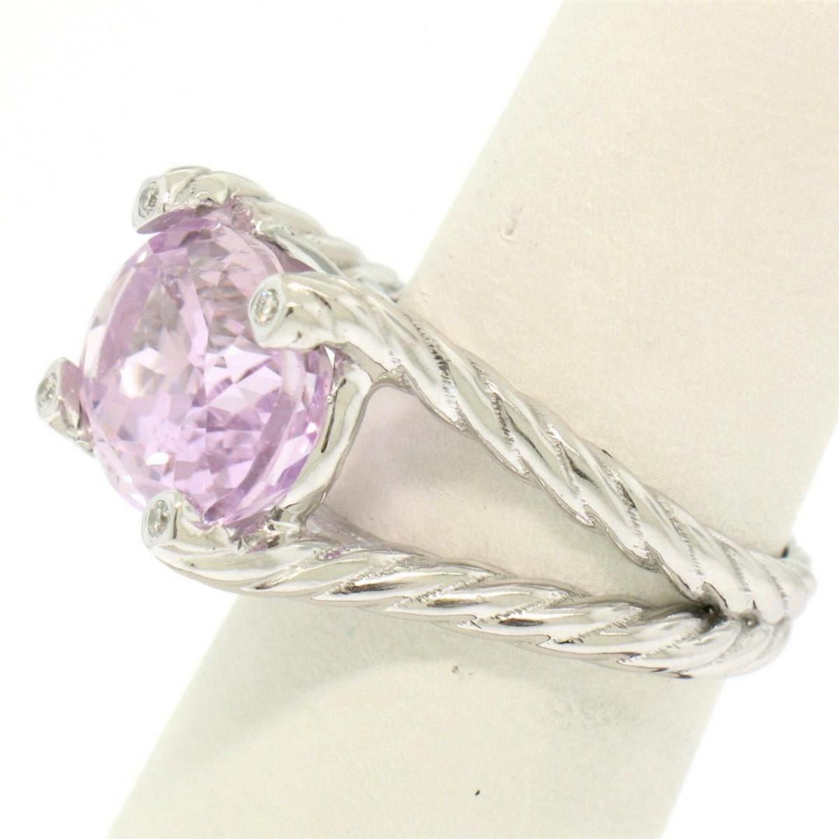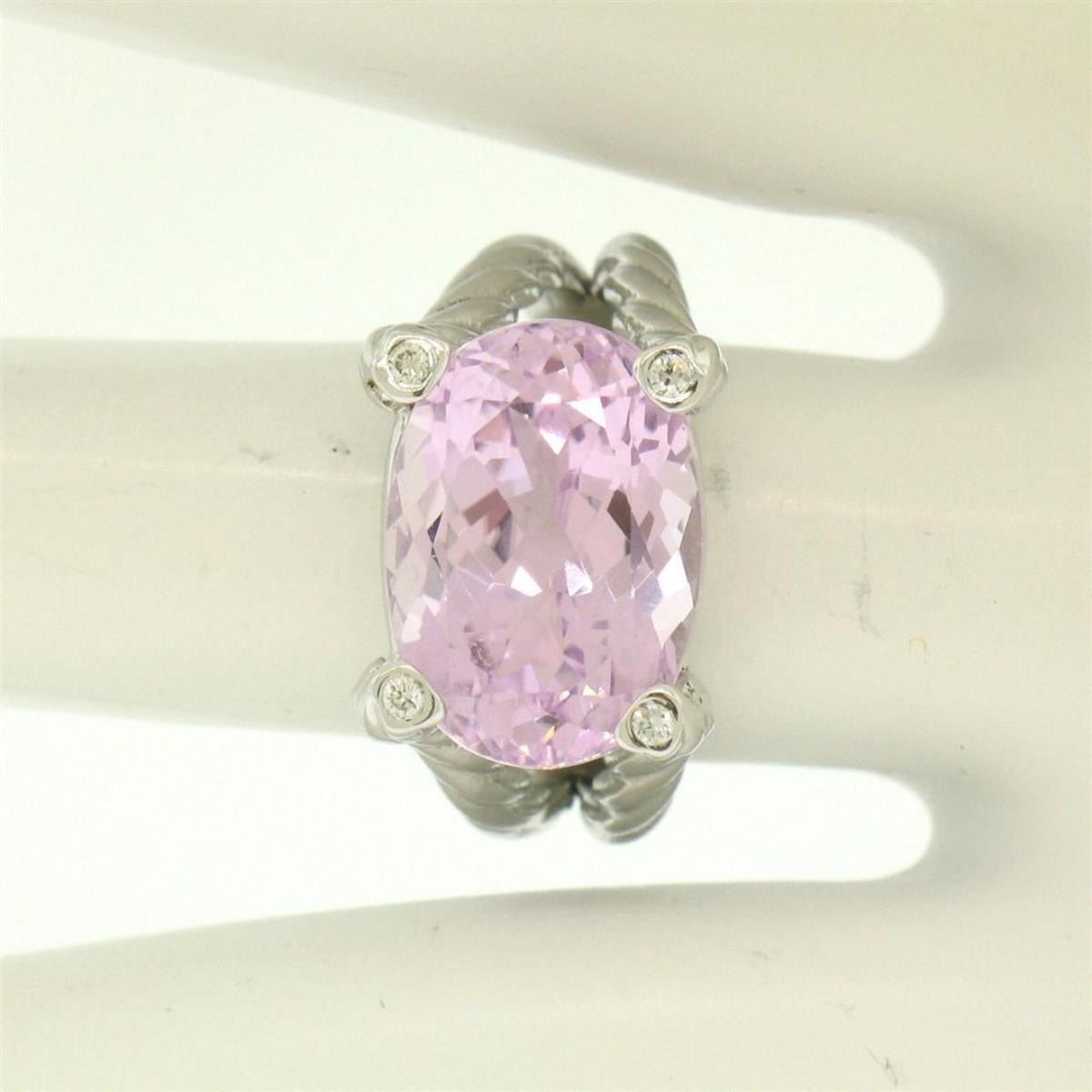 One 14k White Gold Twisted Cable 8.5ct Oval Kunzite Solitaire Ring 4 Burnish Diamond Accents. Item Details: Material: 14k Solid White Gold, Weight: 8.4 Grams, Stone(s): (1) Natural Genuine Kunzite - Oval Cut - Prong Set - Rich, Vivid Pink Color - 8.50 ct (approx.), (4) Natural Genuine Diamonds - Round Brilliant Cut - Burnish Set - VS2 Clarity - G Color - 0.06ctw (approx.), Total Carat Weight: 8.56 (approx.), Ring Size: 5.75 (We can custom size this ring.), Ring Width: 11.66mm, Ring Height: 8.99mm rise off the finger, Condition: Like New!