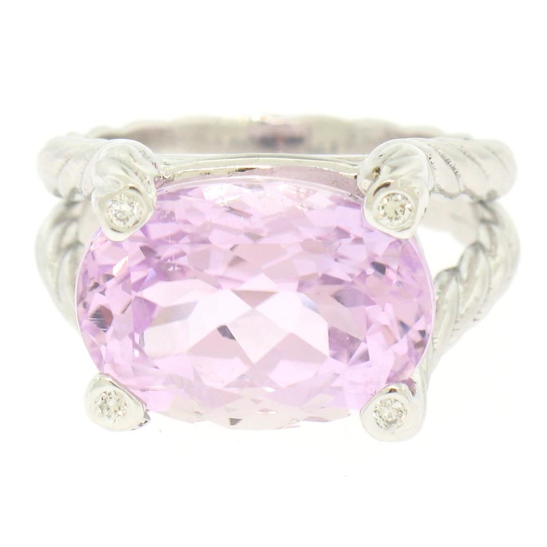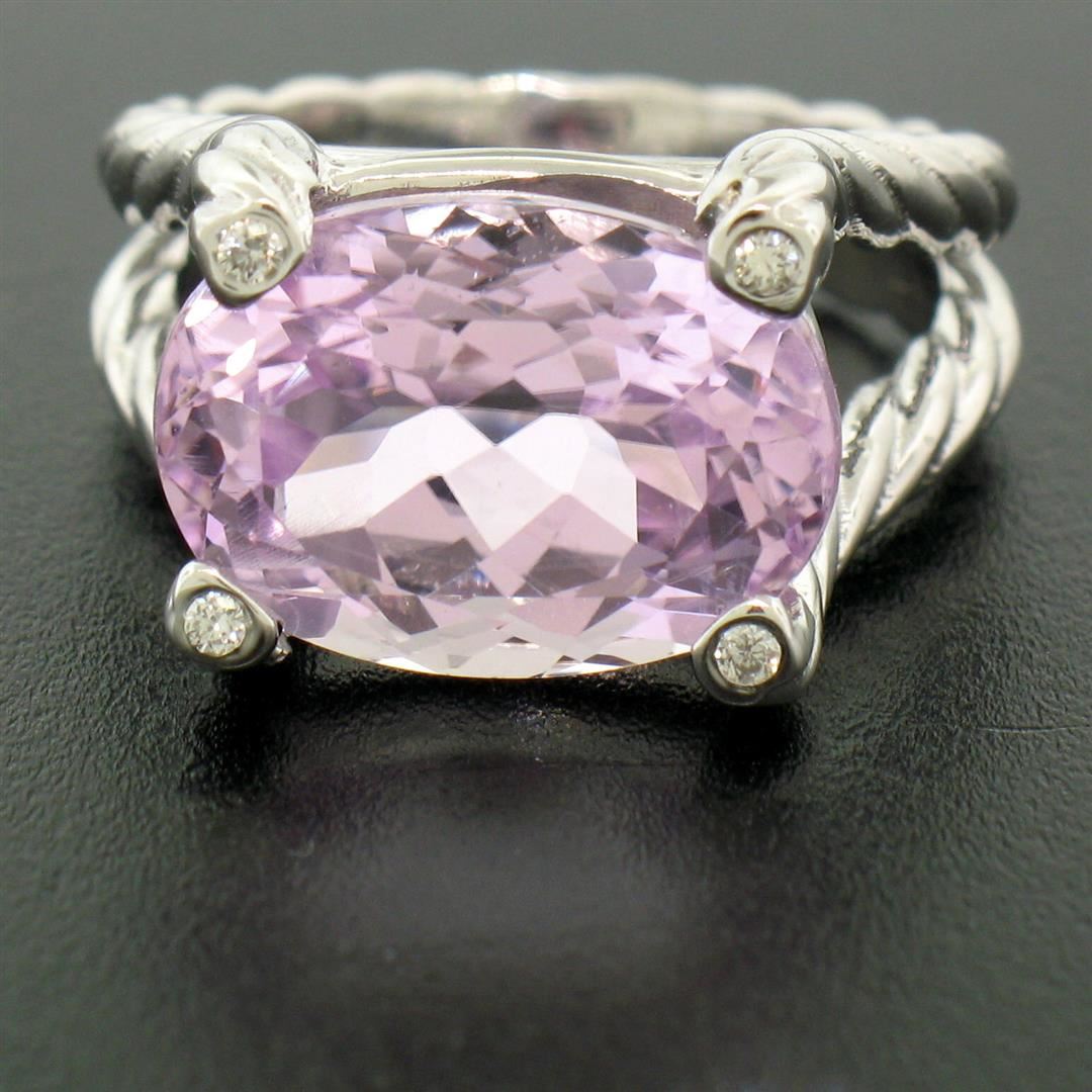 A solid 14k white gold band ring, with 1 oval cut natural kunzite (8.50ct ), and 4 round brilliant cut natural diamonds (VS2 ; G - 0.06ctw). The ring is size 5.75, weighs a total of 8.4 grams, and measures 11.66mm wide.