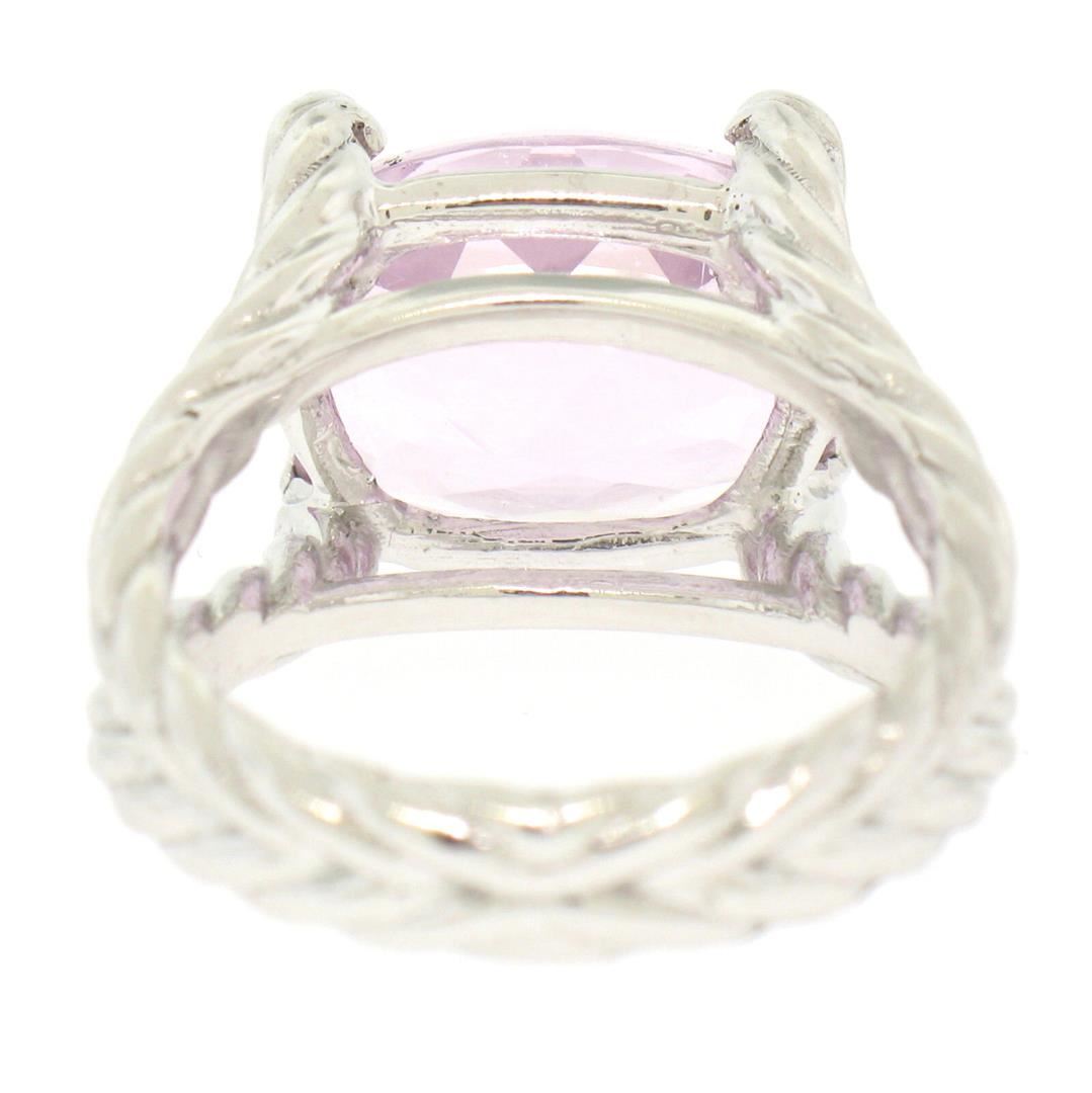 A solid 14k white gold band ring, with 1 oval cut natural kunzite (8.50ct ), and 4 round brilliant cut natural diamonds (VS2 ; G - 0.06ctw). The ring is size 5.75, weighs a total of 8.4 grams, and measures 11.66mm wide.
