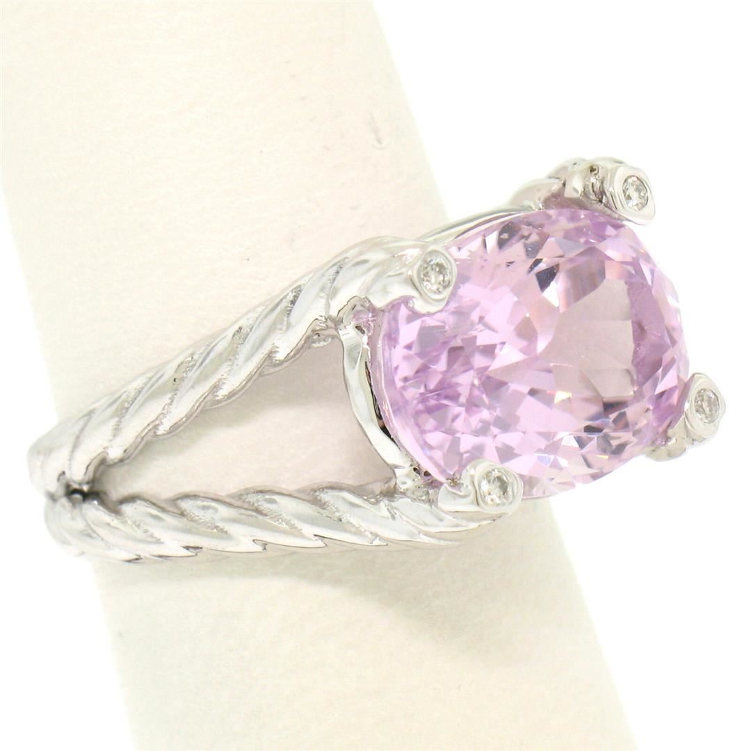 A solid 14k white gold band ring, with 1 oval cut natural kunzite (8.50ct ), and 4 round brilliant cut natural diamonds (VS2 ; G - 0.06ctw). The ring is size 5.75, weighs a total of 8.4 grams, and measures 11.66mm wide.
