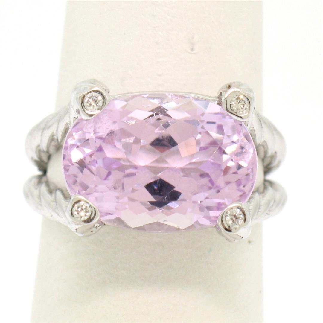 A solid 14k white gold band ring, with 1 oval cut natural kunzite (8.50ct ), and 4 round brilliant cut natural diamonds (VS2 ; G - 0.06ctw). The ring is size 5.75, weighs a total of 8.4 grams, and measures 11.66mm wide.