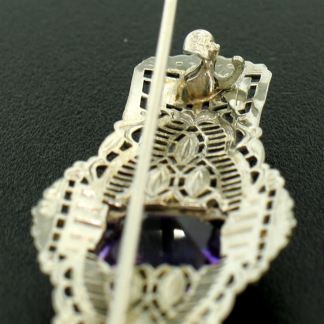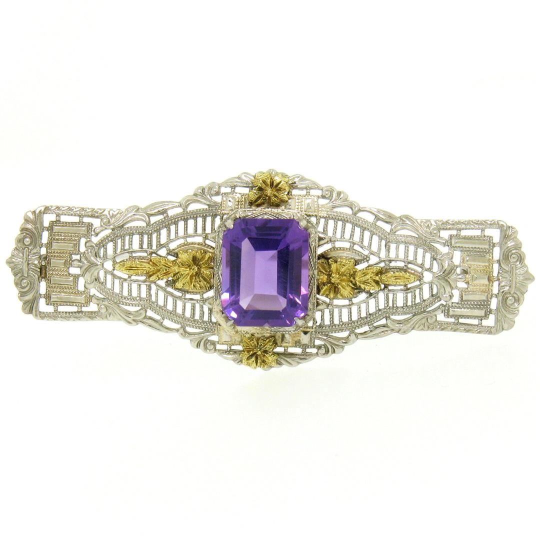 One Art Deco 14k White & Green Gold 3.00ct Emerald Cut Amethyst Filigree Brooch Pin. Item Details: Material: Solid 14k White and Green Gold, Weight: 4.6 Grams, Stone(s): (1) Natural Genuine Amethyst - Emerald Cut - Prong Set - Beautiful, Rich Royal Purple Color - 9.98x8.01x5.44mm, Total Carat Weight: 3.00 (approx.), Height: 18.97mm, Width: 49.49mm, Thickness: 5.44mm, Condition: Antique, art deco period piece. Pin and closure on back are secure and working perfectly. Excellent overall condition!