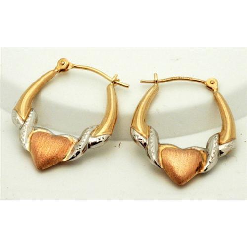 Gorgeous tri tone heart earrings. The heart is rose gold being held by a twisted white gold design peice. The vertical sides are yellow gold. <p> They mearuse 7/8" long x 5/8 " wide. <p>