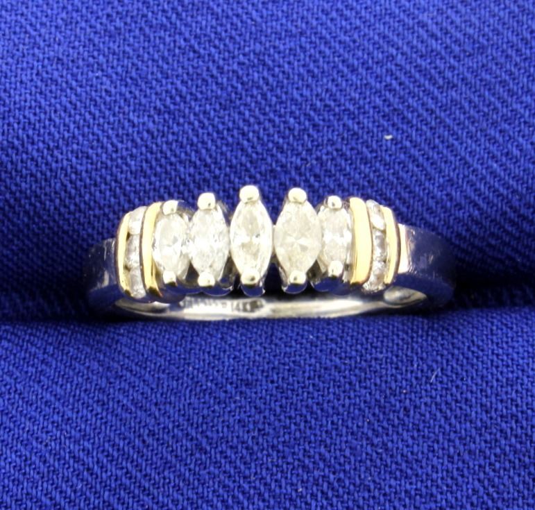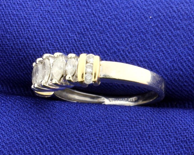 There are 5 marquise approx. .38ct TW, with approx.. SI2-I2 clarity and J-K color. There are 6 brilliant cut diamonds for a total of 0.12cts, clarity I1 and color J-K. Size 7. 3.9g