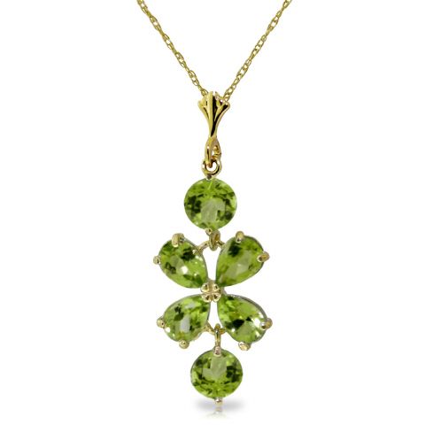 The beauty of nature shines with this 14k solid gold necklace with natural peridot. A beautiful floral shape made of green peridot stones looks feminine and beautiful. Four pear shaped stones form a flower with four petals, while two round cut stones are used to add more shine and emphasize this stunning shape. Over three carats of sparkle radiate from this stunning pendant, which makes a fabulous August birthstone pendant or for anyone who loves floral designs and color. This jewelry piece is shipped in an elegant black jewelry box and is accompanied by an Appraisal Certificate. Retail price: $1228