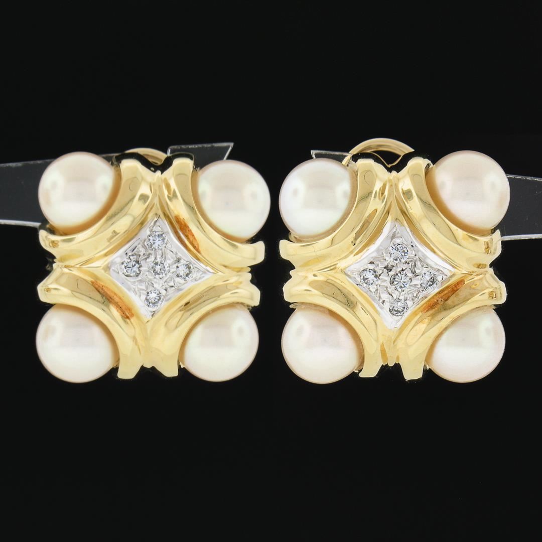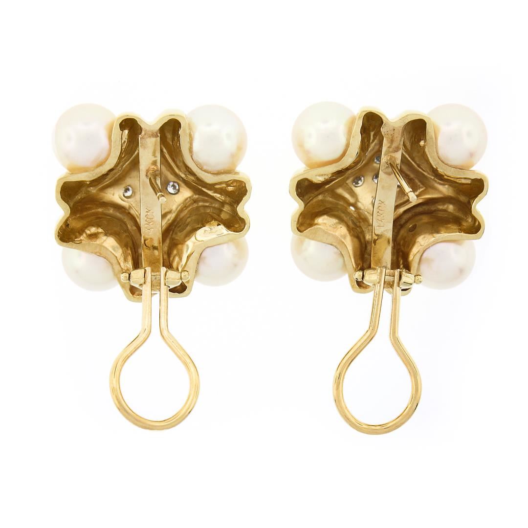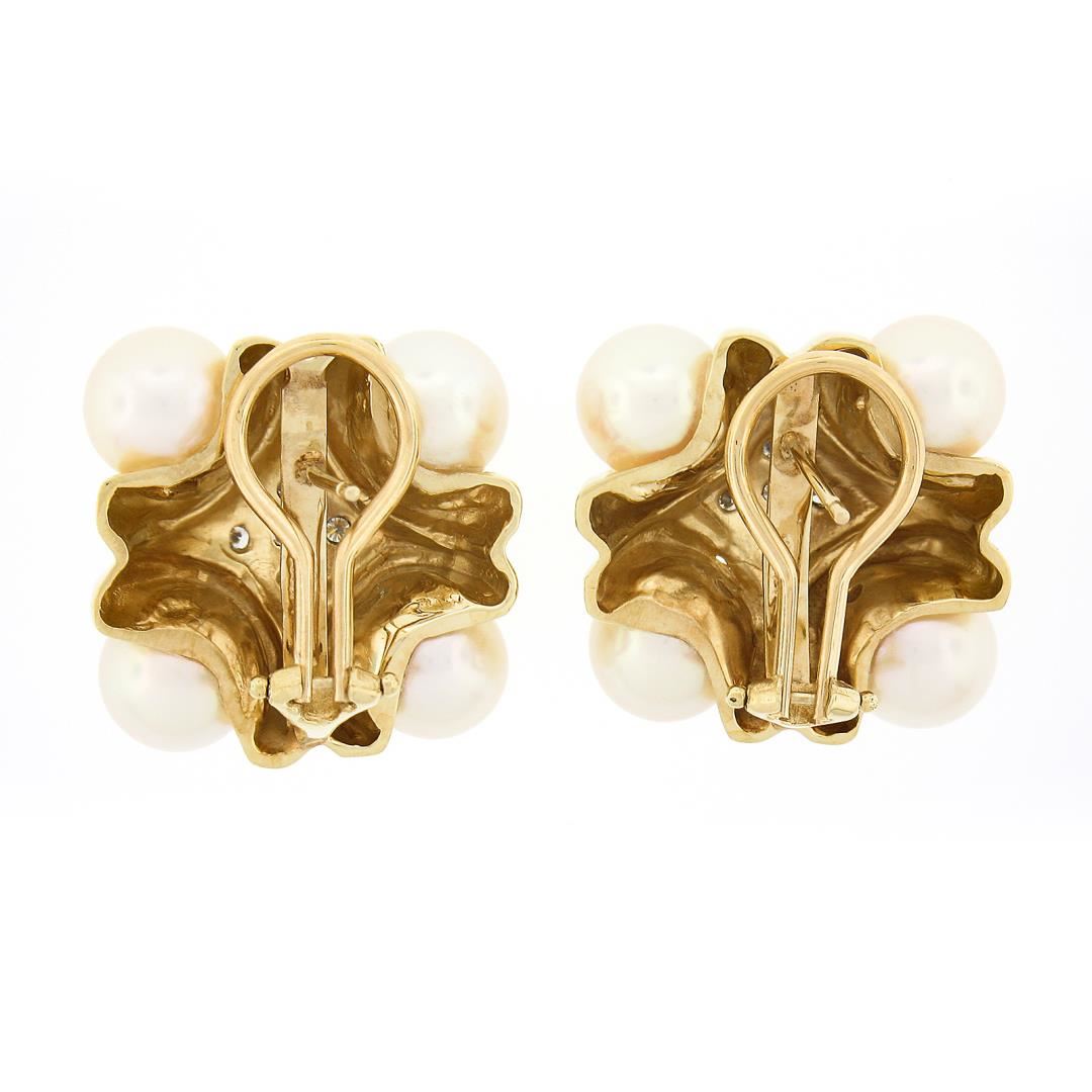 A solid 14k yellow gold button earrings, with 8 round shape cultured pearls (7.6mm each), and 10 round brilliant cut natural diamonds (G/H - SI1 ; 0.15ctw). The earrings measure approximately 21x20.7mm and weigh a total of 18.69 grams.