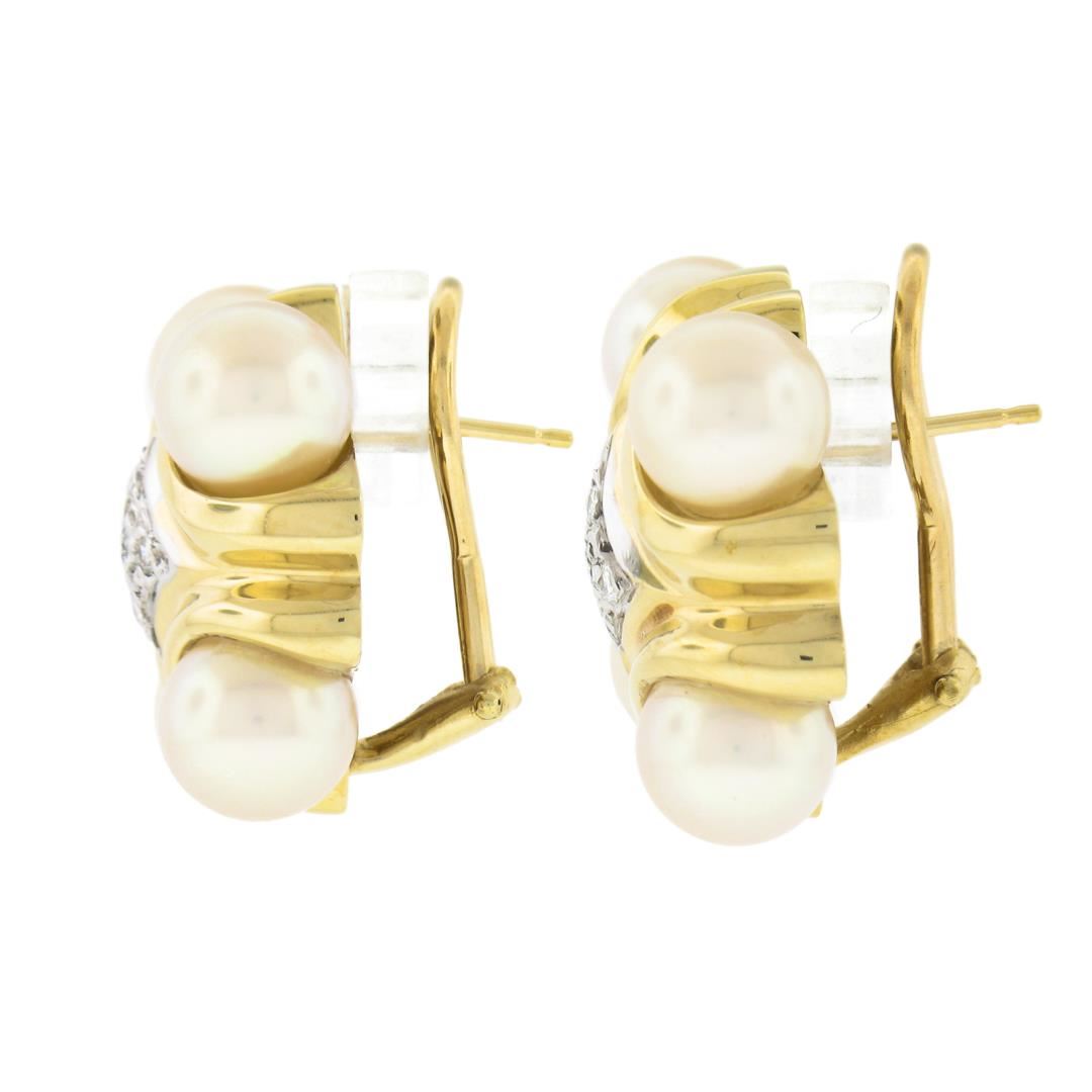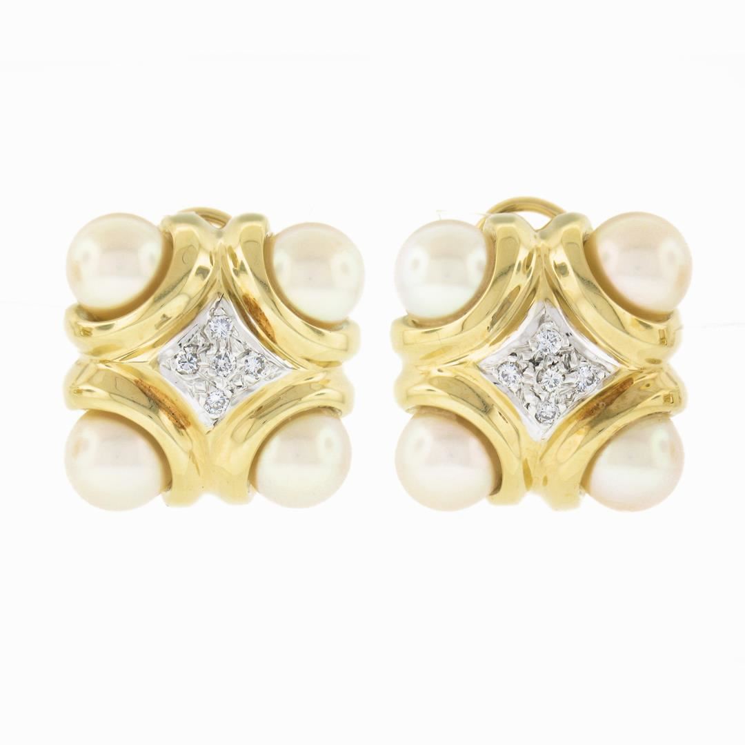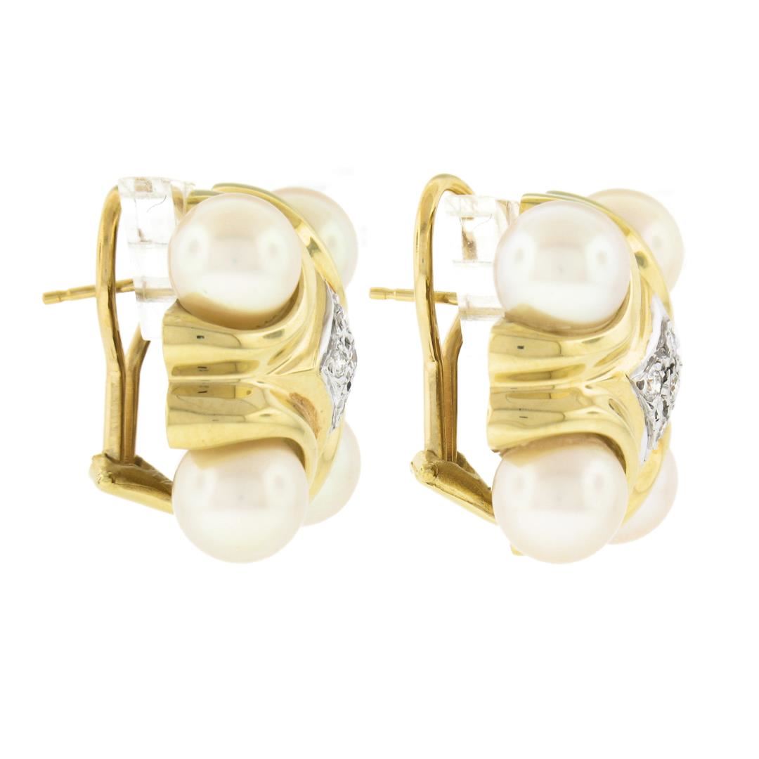A solid 14k yellow gold button earrings, with 8 round shape cultured pearls (7.6mm each), and 10 round brilliant cut natural diamonds (G/H - SI1 ; 0.15ctw). The earrings measure approximately 21x20.7mm and weigh a total of 18.69 grams.