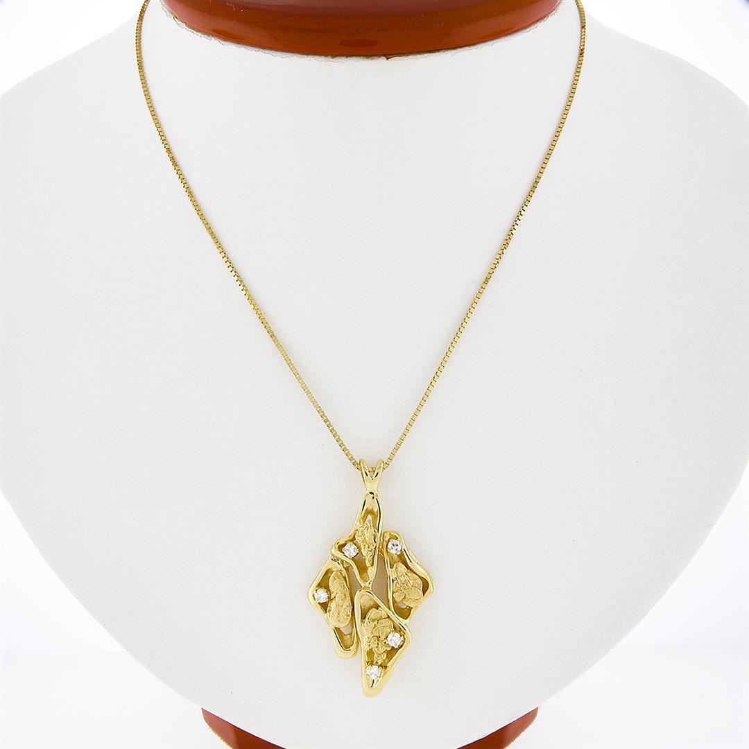 A solid 14k yellow gold pendant necklace, with 5 round brilliant cut natural diamonds (F/G - VS1/VS2 ; 0.25ctw). The pendant weighs a total of 12.67grams, measures 42.65x22.90mm including the bail, and 18 inch box link chain.