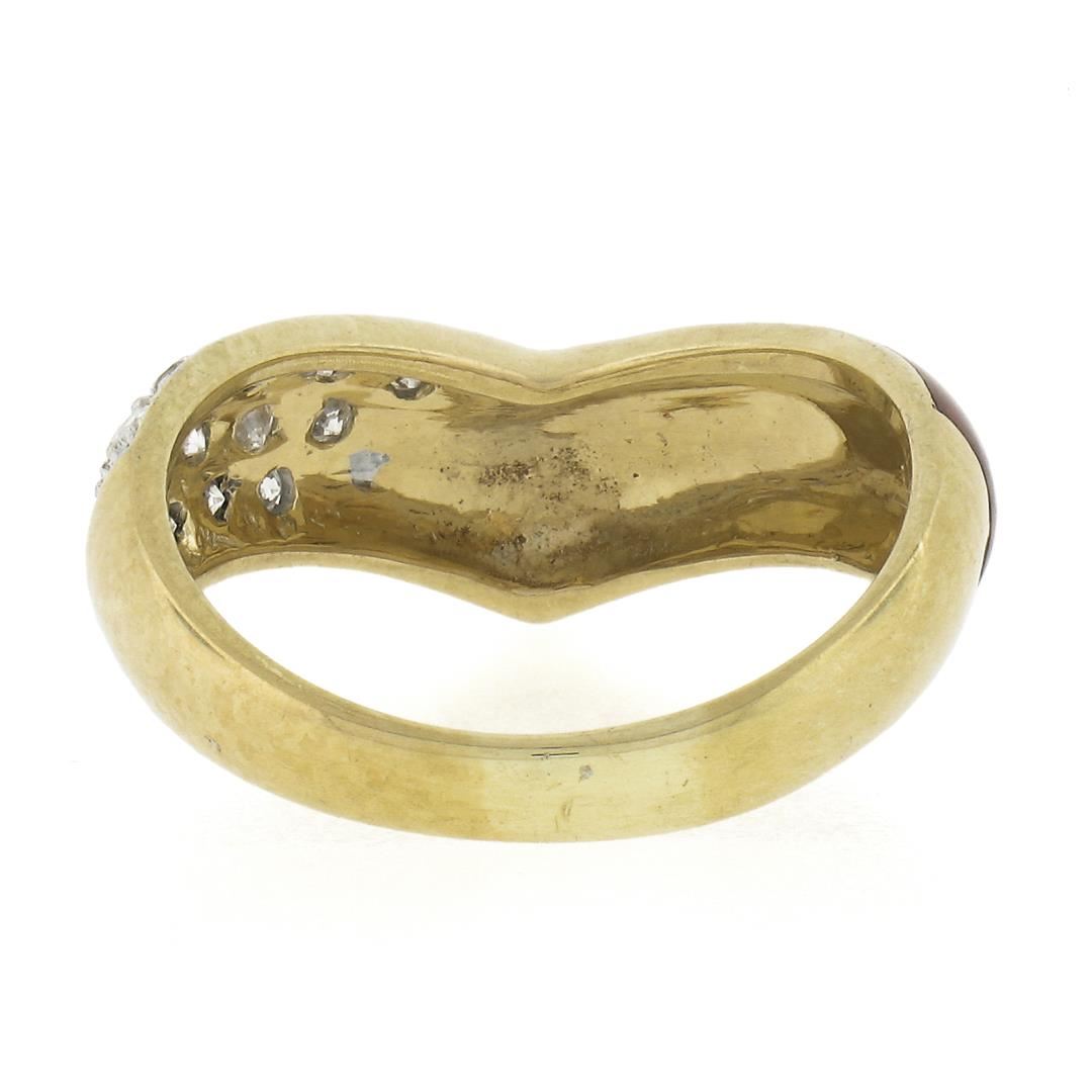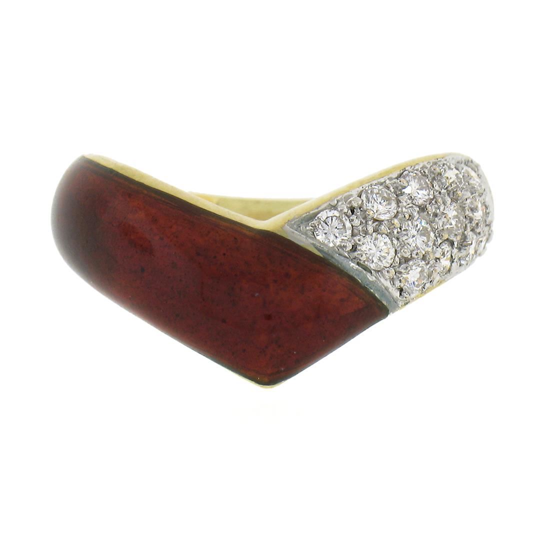 A solid 14k yellow gold & red enamel wotl v band ring, with 14 round cut natural diamonds (F/G - VS1-SI1 ; 0.25ctw). The ring is size 6.5, weighs a total of 4.25 grams, and measures 7.9mm wide.