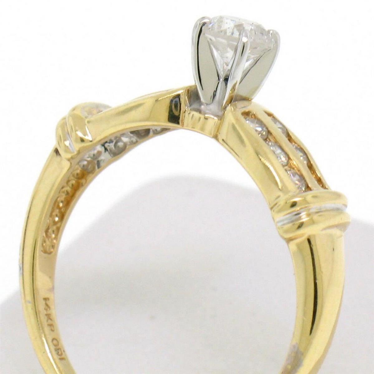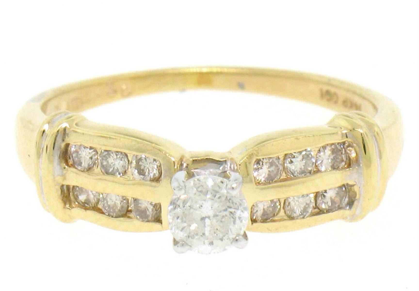 14k Yellow Gold 0.30ctw Round Diamond & Dual Row Channel Accent Engagement Ring. A solid 14k yellow and white gold ring featuring a round brilliant cut natural diamond solitaire (G/H - SI1/SI2; 0.20ct) accented by 12 smaller round brilliant cut natural diamonds (G/H - SI1/SI2; 0.10ctw). The ring is size 6.25, weighs a total of 2.8 grams, and measures 5.58mm wide.