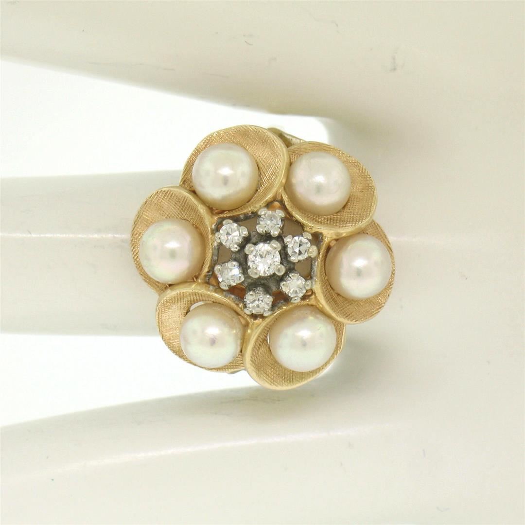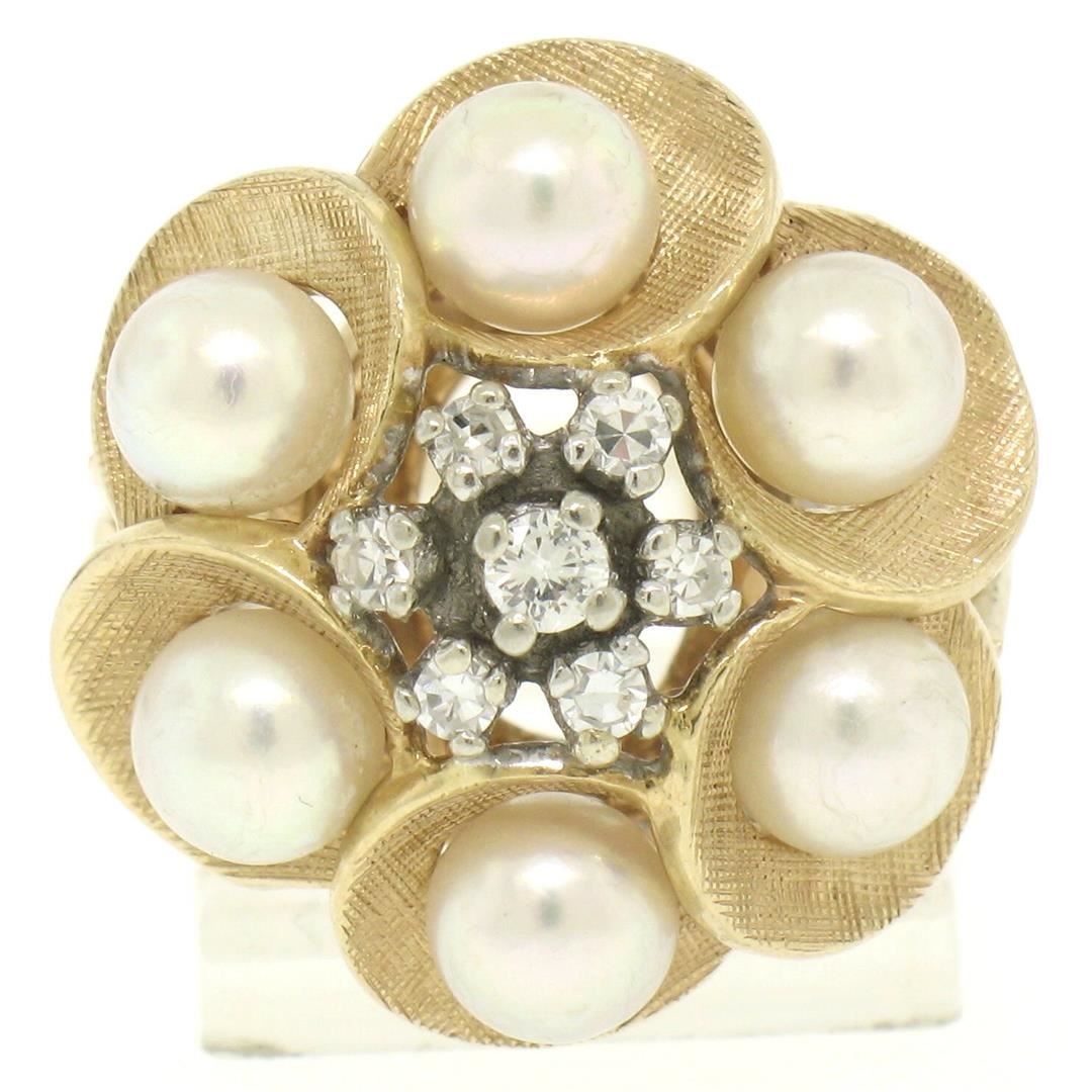 One 14k Yellow Gold 0.30ctw Round Diamond & Pearl Cluster Ring w/ Florentine Finish. Item Details: Material: Solid 14k Yellow Gold, Weight: 9.47 Grams, Stone(s): (1) Natural Genuine Diamond - Round Brilliant Cut - Prong Set - H Color - VS1 Clarity - 0.06ct (approx.), (6) Natural Genuine Diamonds - Round Single Cut - Prong Set - H Color - VS1 Clarity - 0.24ctw (approx.), (6) Genuine Pearls - Round Shape - Stem Set - White w/ Soft Pink Overtones - 5.10mm (approx.), Total Carat Weight: 0.30 (approx.), Ring Size: 7.0 , Ring Width: 20.80mm Ring Height: 13.37mm rise off the finger Condition: Estate piece. Excellent condition!