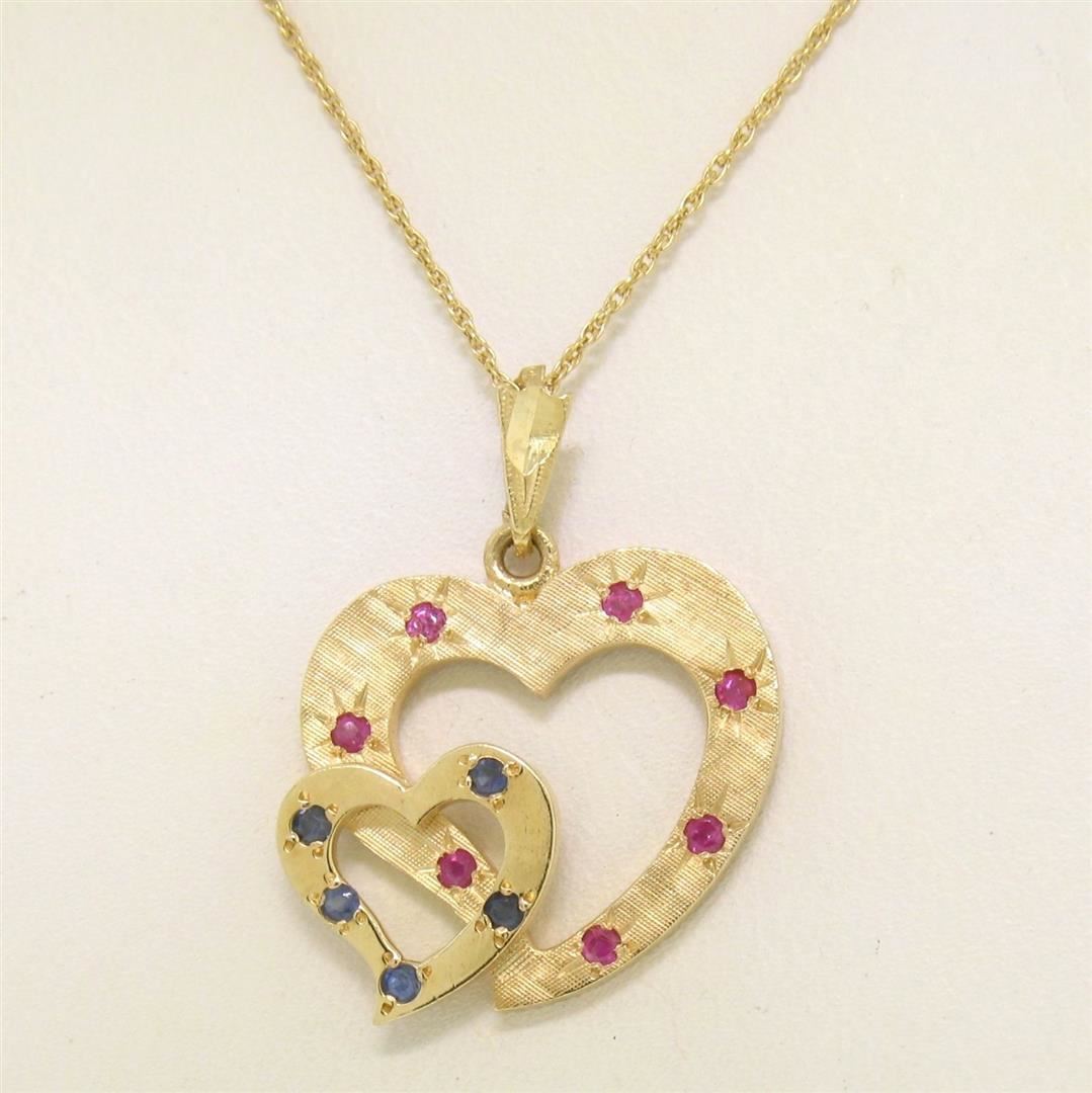 14k Yellow Gold 0.48ctw Round Ruby & Sapphire Double Heart Dual Finish Pendant. Please see photos and description for all available information. An estate solid 14k yellow gold double heart pendant necklace, featuring 7 round brilliant cut natural rubies