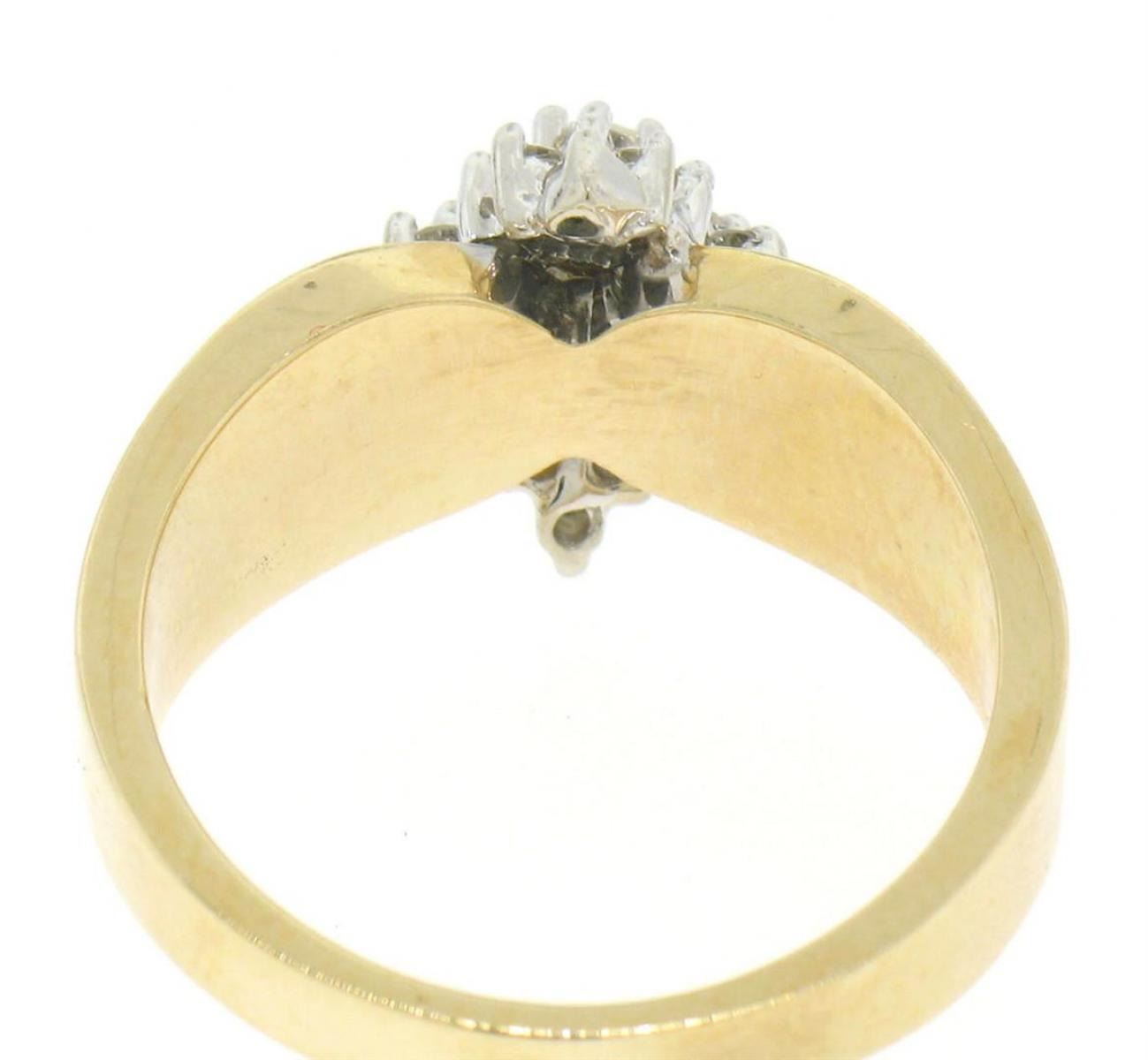 14k Yellow Gold 0.50ctw Terraced Round Brilliant Diamond Cluster Cocktail Ring. A solid 14k yellow gold ring featuring 21 round brilliant cut natural diamonds (G/H - VS2/SI1) prong set in a tiered diamond shape. The ring is size 6.25, weighs a total of 5.90 grams, and measures 11.66mm wide.