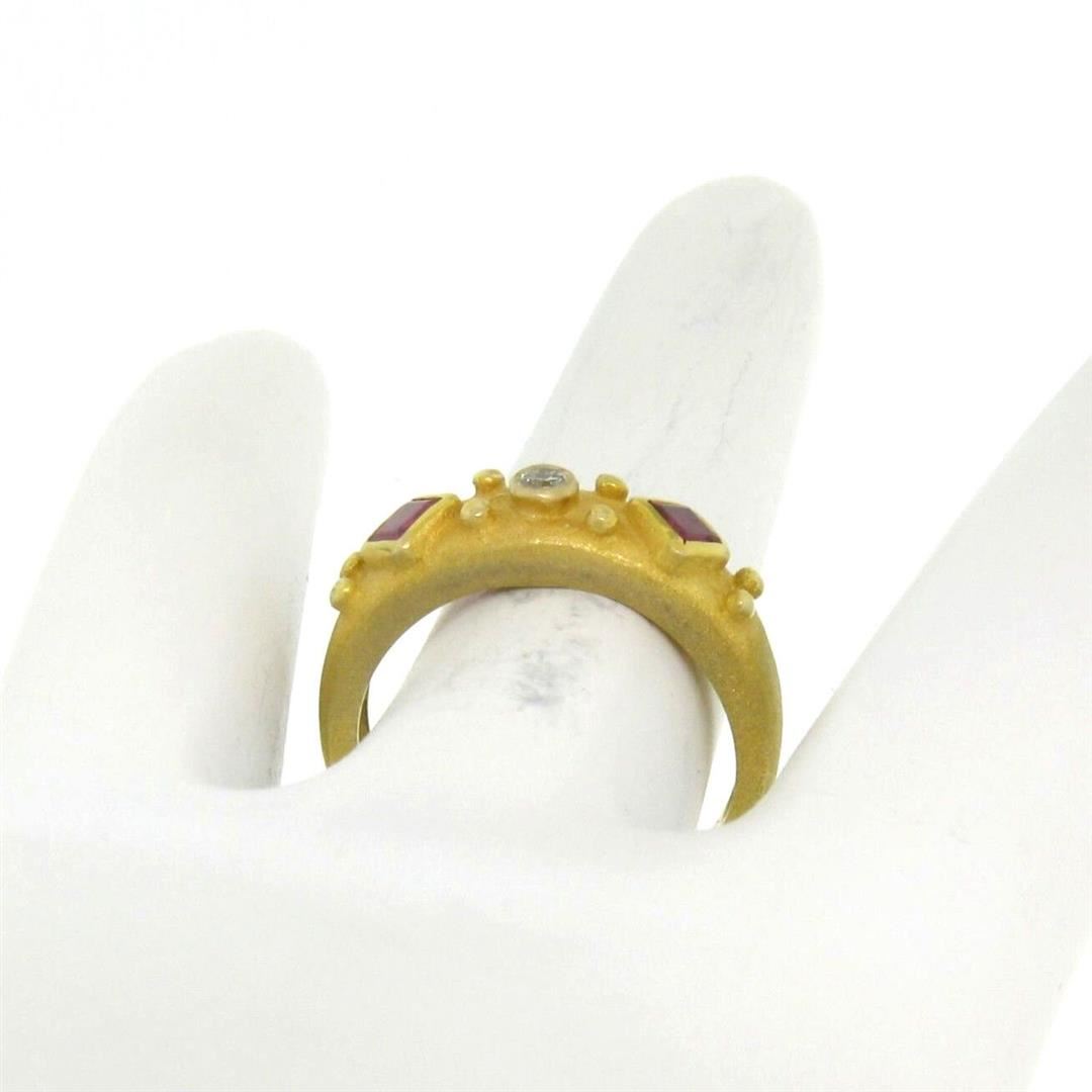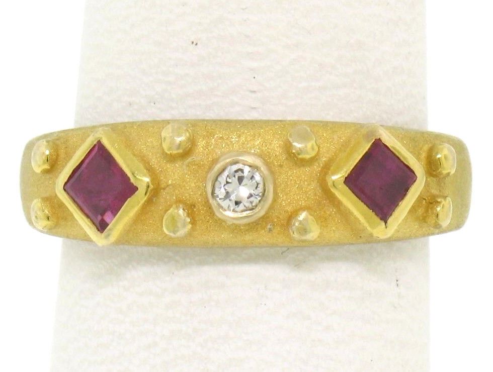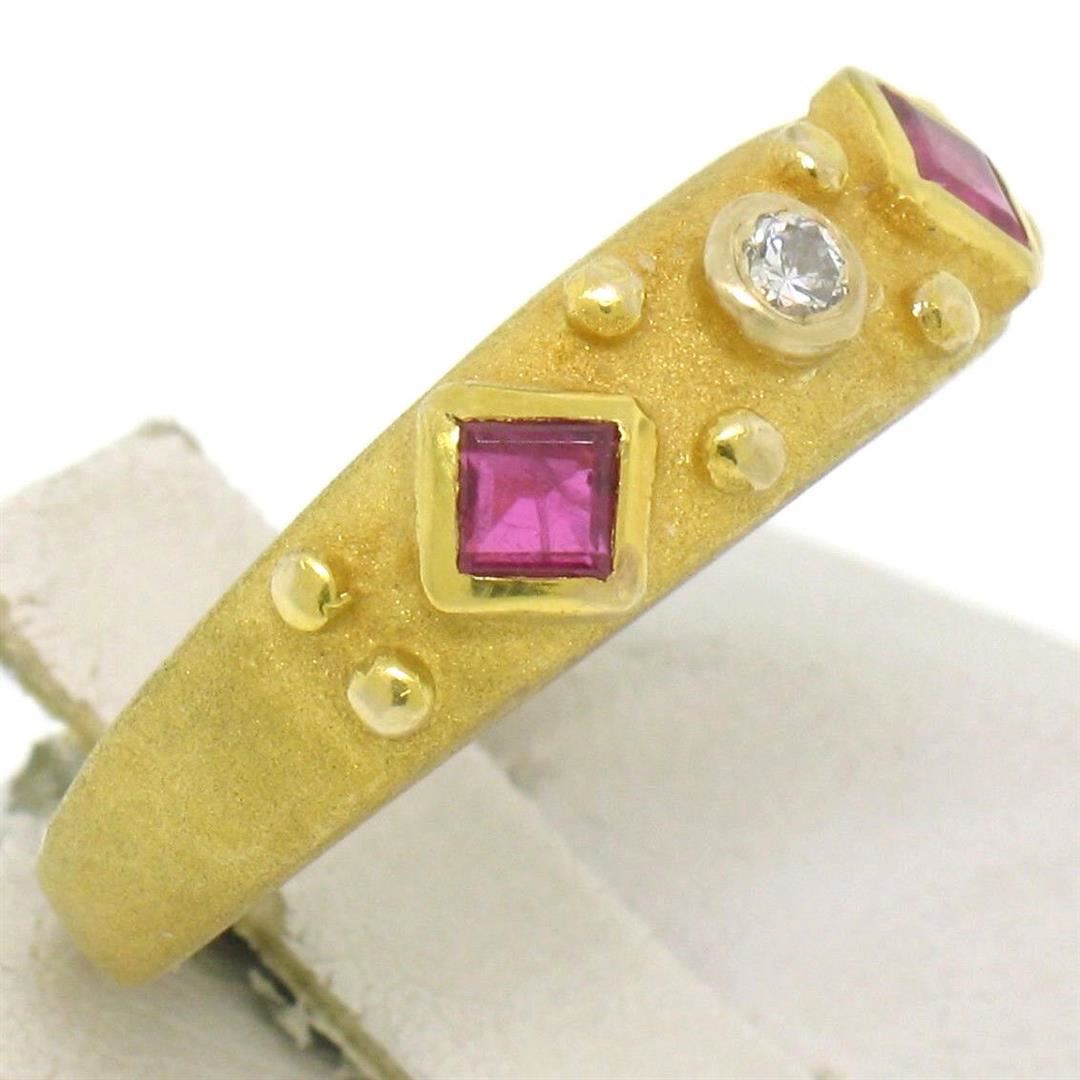 14k Yellow Gold 0.55ctw Square Blood Ruby Round Diamond Sandblasted Band Ring. Please see photos and description for all available information. An estate solid 14k yellow gold sandblasted band ring, featuring 2 square step cut natural rubies (0.50ctw), and 1 round brilliant cut natural diamond (F- VS1; 0.05ctw). The ring is size 5.5, weighs a total of 3.7 grams, and measures 5.5mm wide.