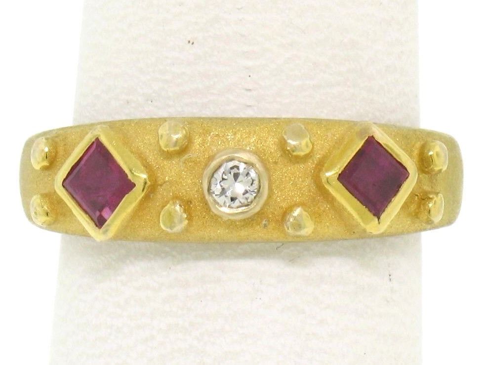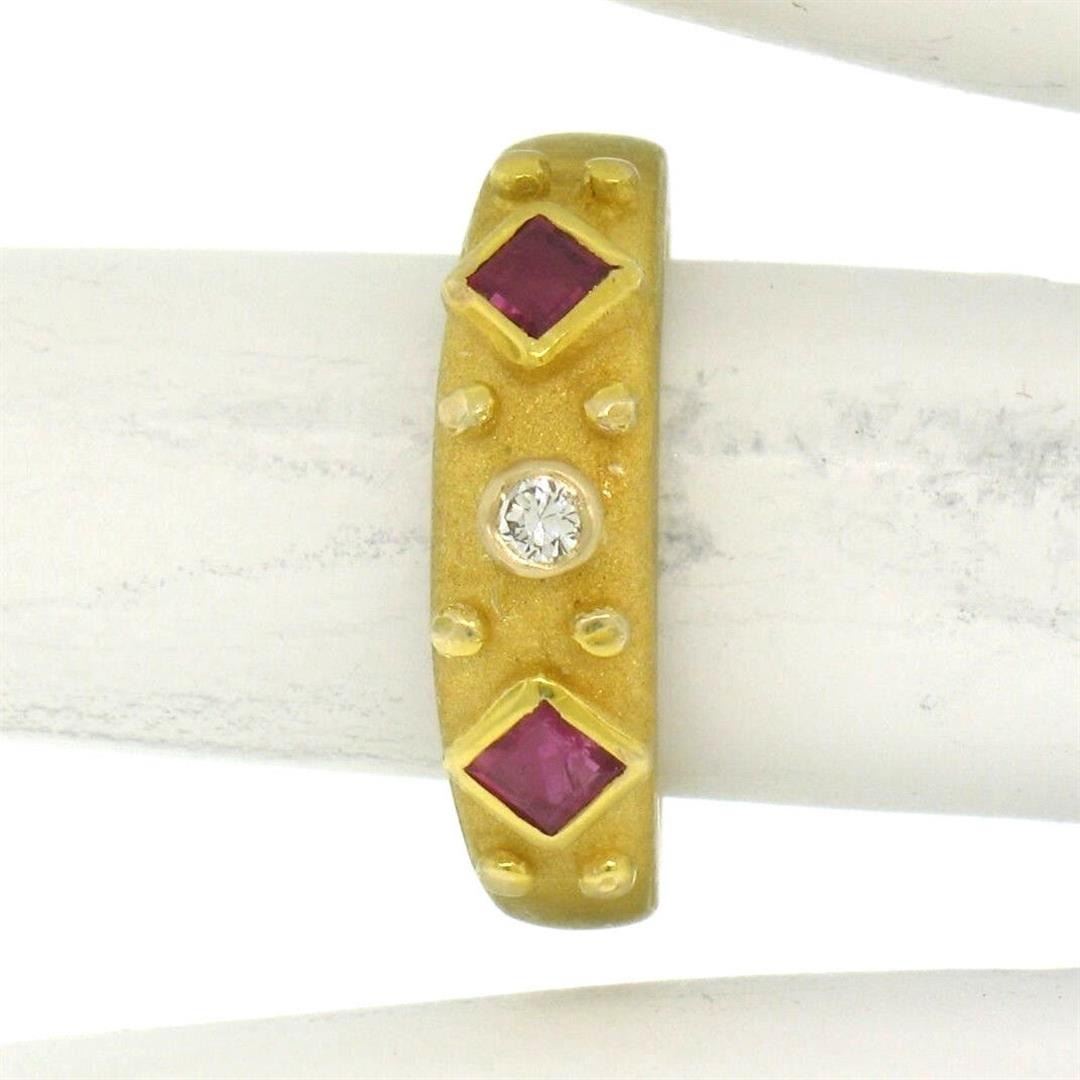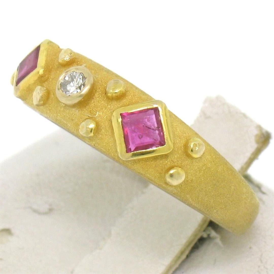 14k Yellow Gold 0.55ctw Square Blood Ruby Round Diamond Sandblasted Band Ring. Please see photos and description for all available information. An estate solid 14k yellow gold sandblasted band ring, featuring 2 square step cut natural rubies (0.50ctw), and 1 round brilliant cut natural diamond (F- VS1; 0.05ctw). The ring is size 5.5, weighs a total of 3.7 grams, and measures 5.5mm wide.