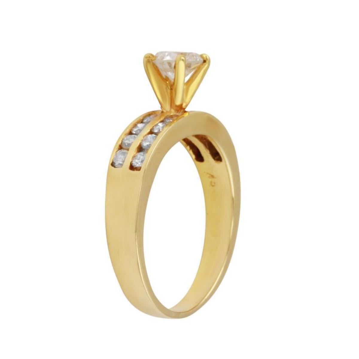 This beautiful brightly polished and stamped 14k yellow gold engagement ring showcases one round brilliant cut prong set diamond in the center totaling 0.51ctw with H-I color and SI1-SI2 clarity. There are a total of sixteen sparkling round brilliant cut diamonds channel set on each side, with a total weight of 0.24ctw with H-I color and I1-I2 clarity. Diamonds have a total weight of 0.75ctw. The ring tapers into a flat 2.50mm wide band on the bottom. Total weight: 3.50 grams. Ring size 5. Reference #: 233710