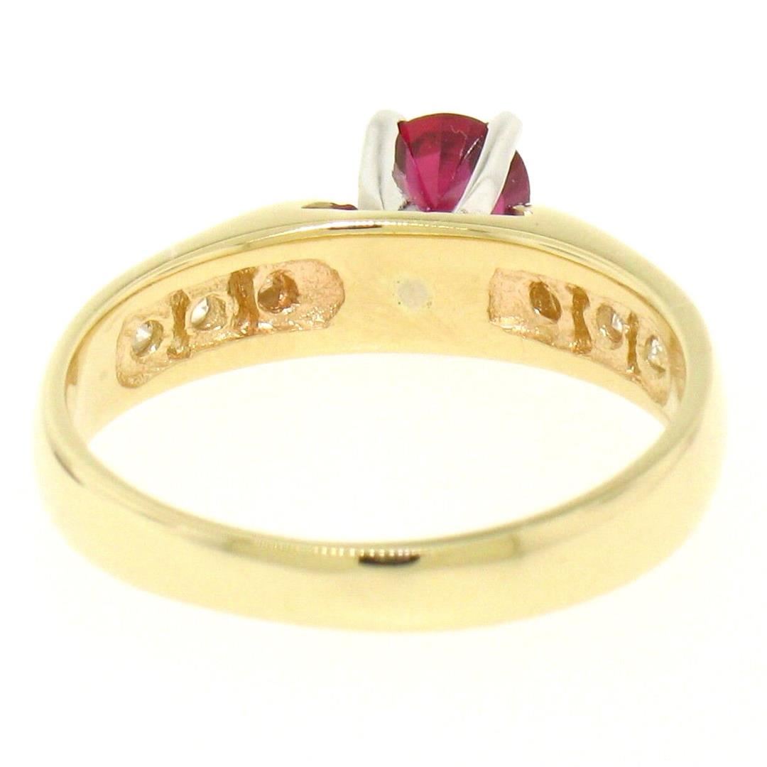 14k Yellow Gold 0.77ctw Round Ruby Solitaire Engagement Ring w/ Diamond Accents. Please see photos and description for all available information. An estate solid 14k yellow and white gold solitaire ring, with 1 round brilliant cut natural ruby (0.59ct), accented with 6 round brilliant cut natural diamonds (G/H- VS2/SI2; 0.18ctw). The ring is size 5.5, weighs a total of 3.1 grams, and measures 4.75mm wide.