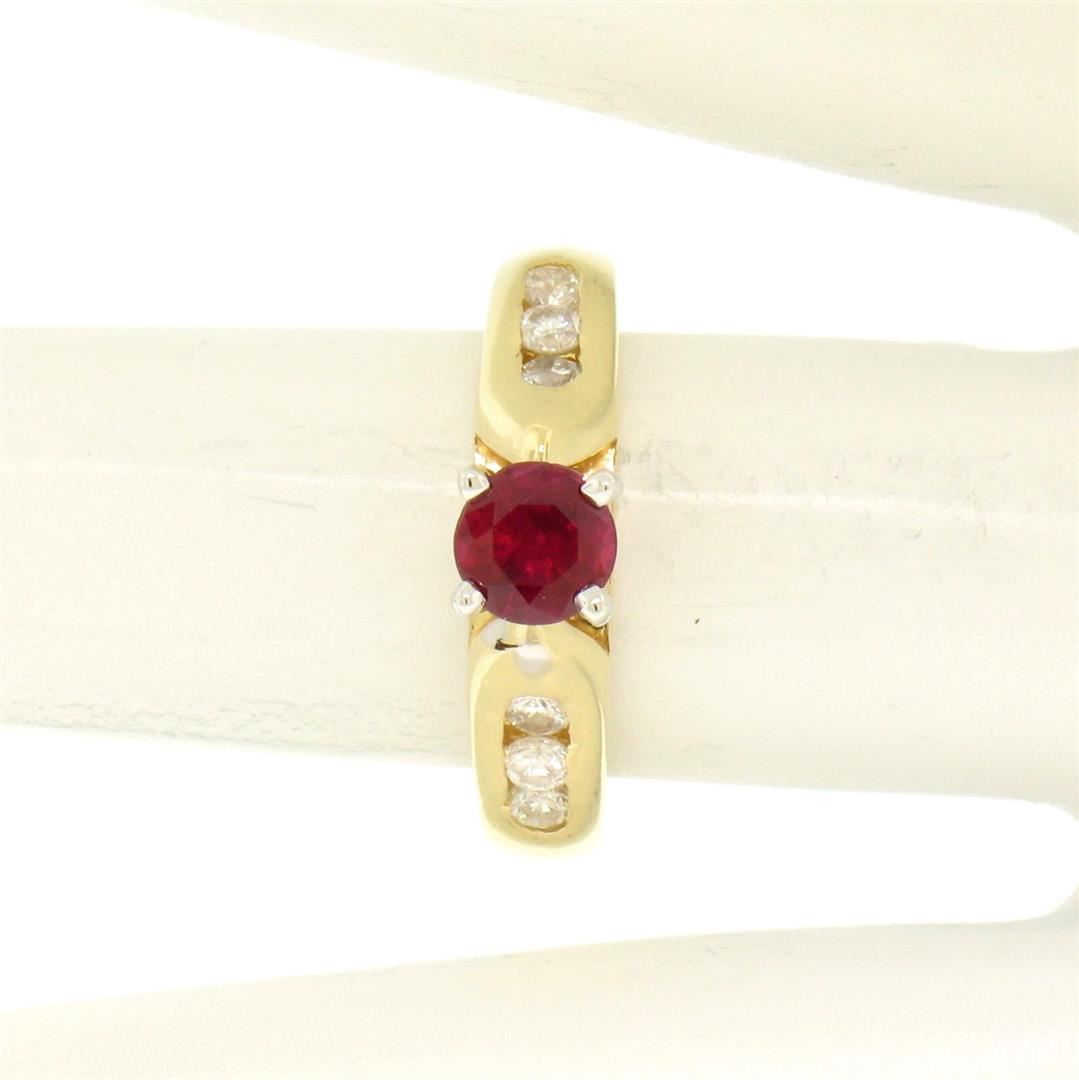 14k Yellow Gold 0.77ctw Round Ruby Solitaire Engagement Ring w/ Diamond Accents. Please see photos and description for all available information. An estate solid 14k yellow and white gold solitaire ring, with 1 round brilliant cut natural ruby (0.59ct), accented with 6 round brilliant cut natural diamonds (G/H- VS2/SI2; 0.18ctw). The ring is size 5.5, weighs a total of 3.1 grams, and measures 4.75mm wide.