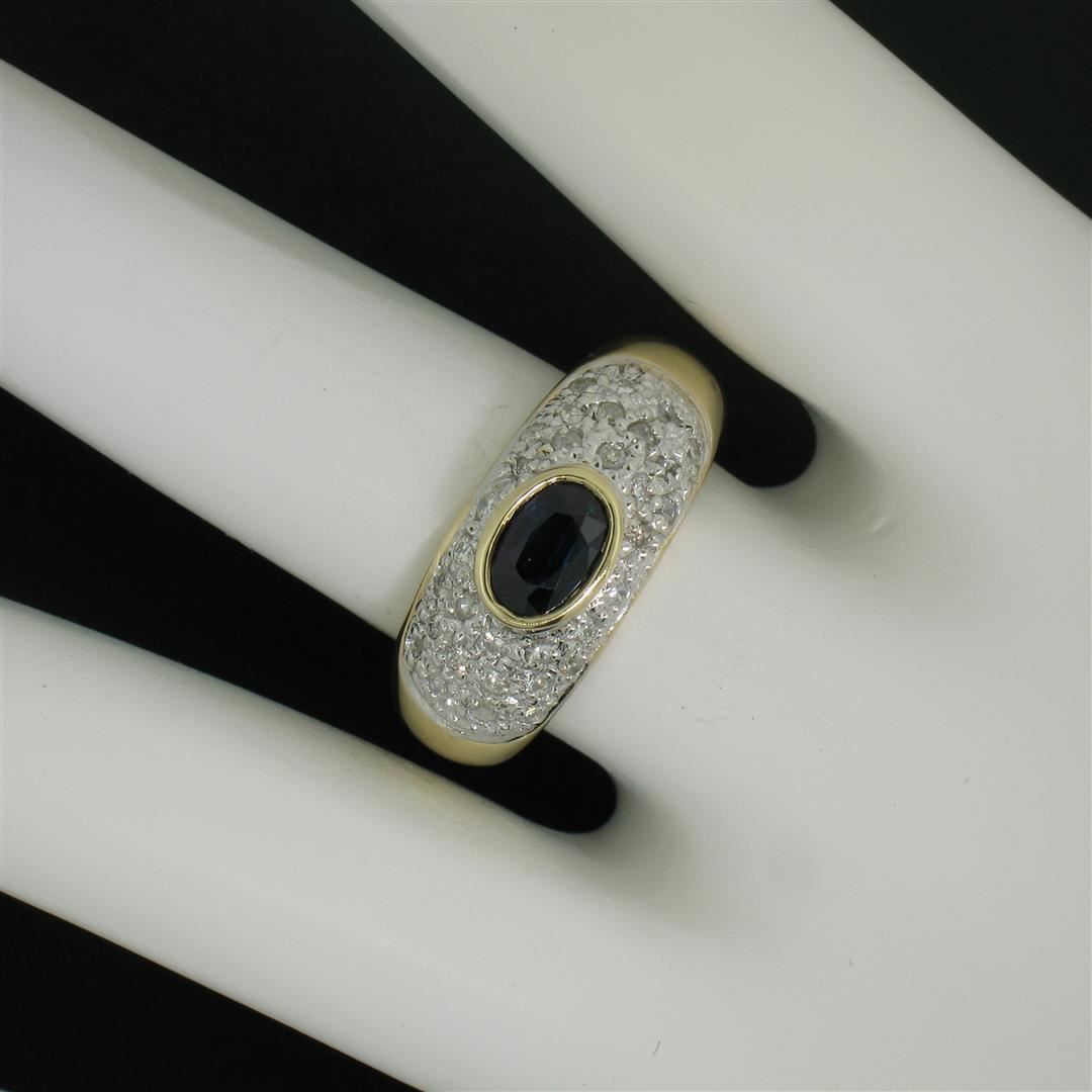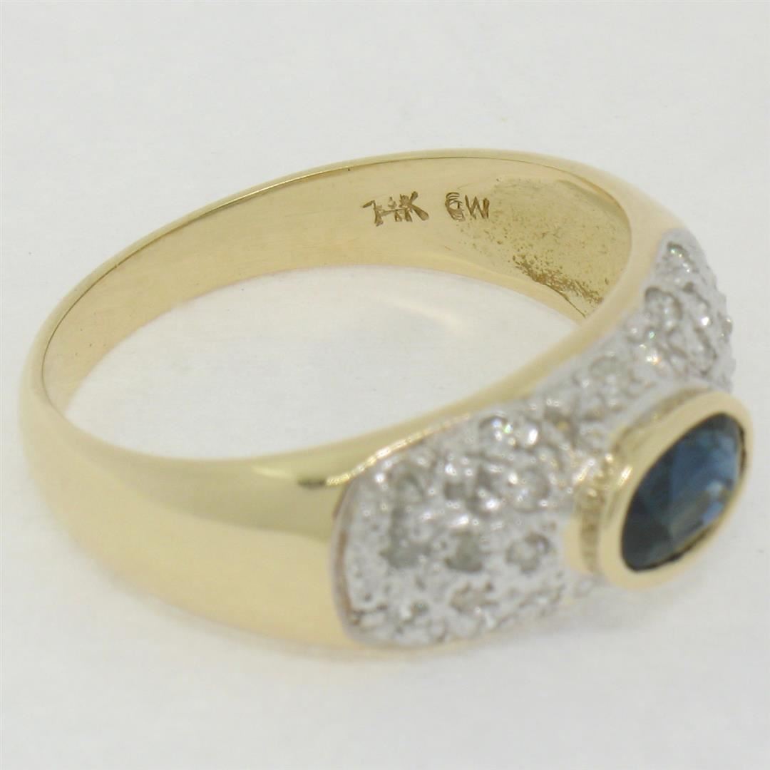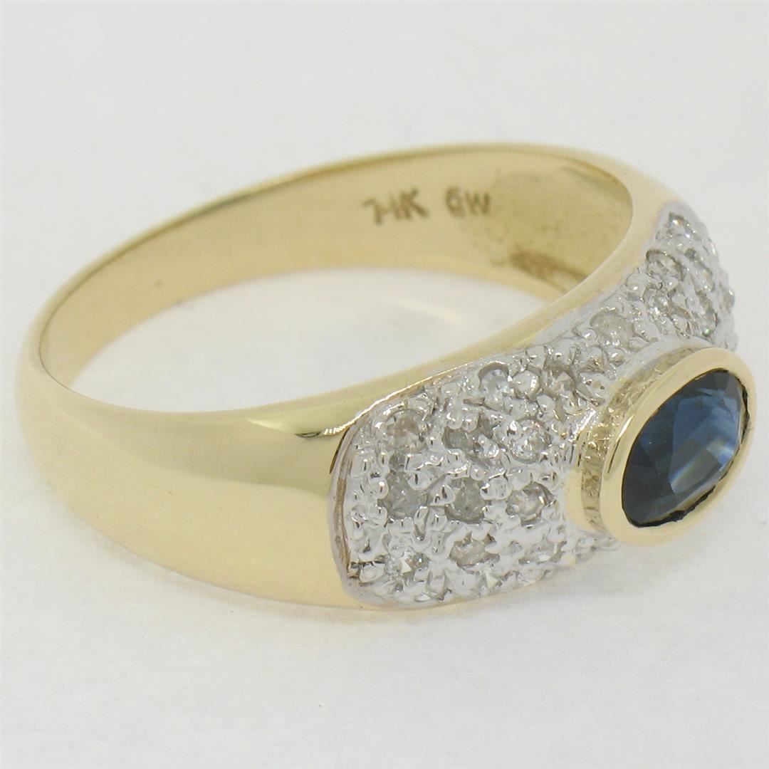 A like new 14k yellow gold band ring with a 0.60ct oval cut sapphire surrounded by 0.25ctw of round diamonds (H/I - SI2/I1). The ring is size 7, weighs a total of 4.2 grams, and measures approximately 8.25mm wide.