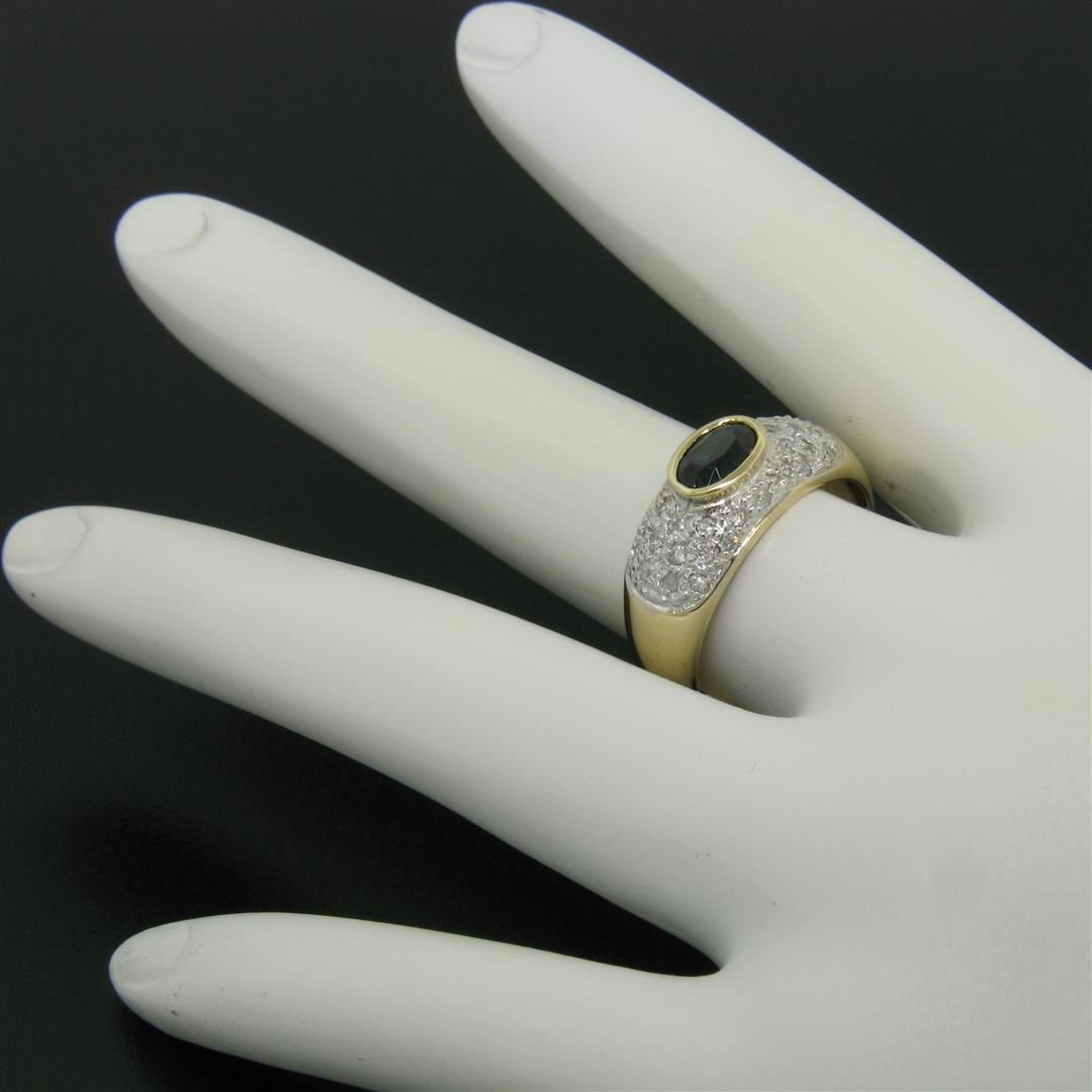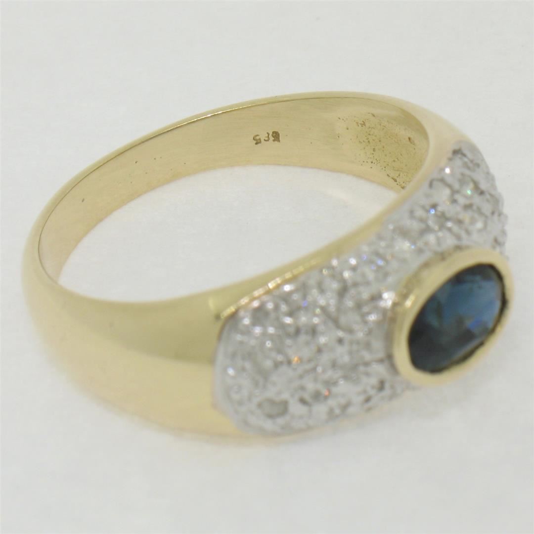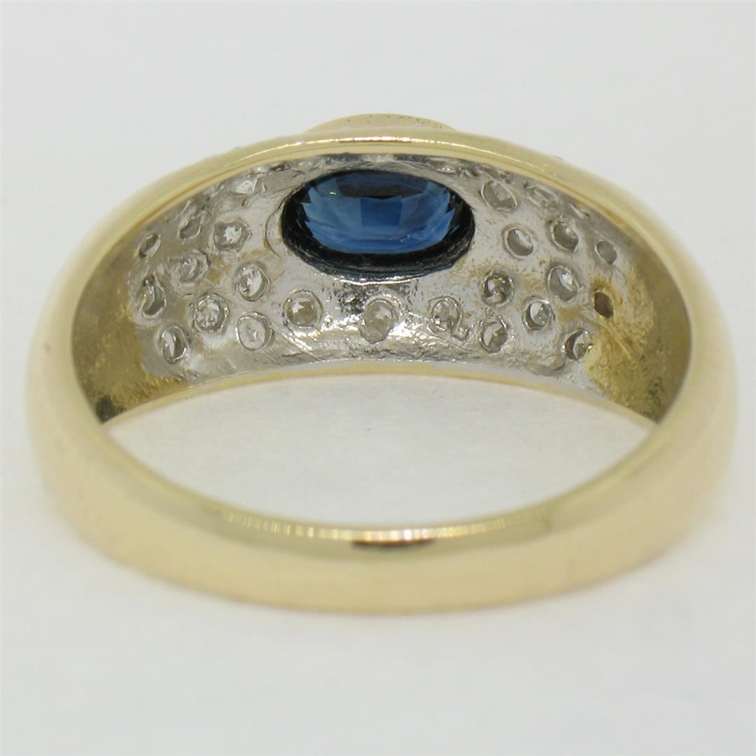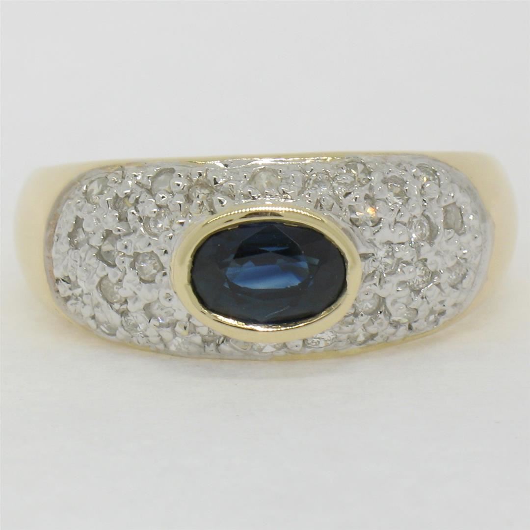 A like new 14k yellow gold band ring with a 0.60ct oval cut sapphire surrounded by 0.25ctw of round diamonds (H/I - SI2/I1). The ring is size 7, weighs a total of 4.2 grams, and measures approximately 8.25mm wide.