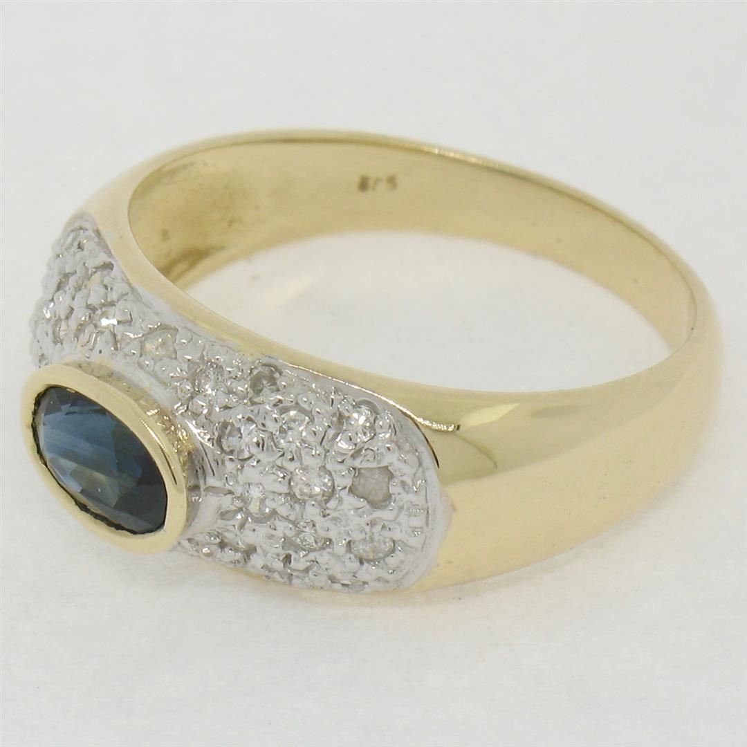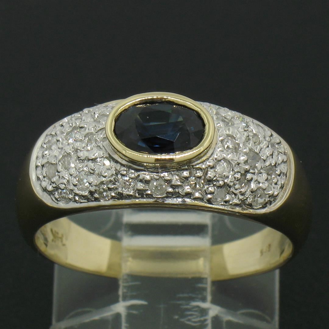 A like new 14k yellow gold band ring with a 0.60ct oval cut sapphire surrounded by 0.25ctw of round diamonds (H/I - SI2/I1). The ring is size 7, weighs a total of 4.2 grams, and measures approximately 8.25mm wide.