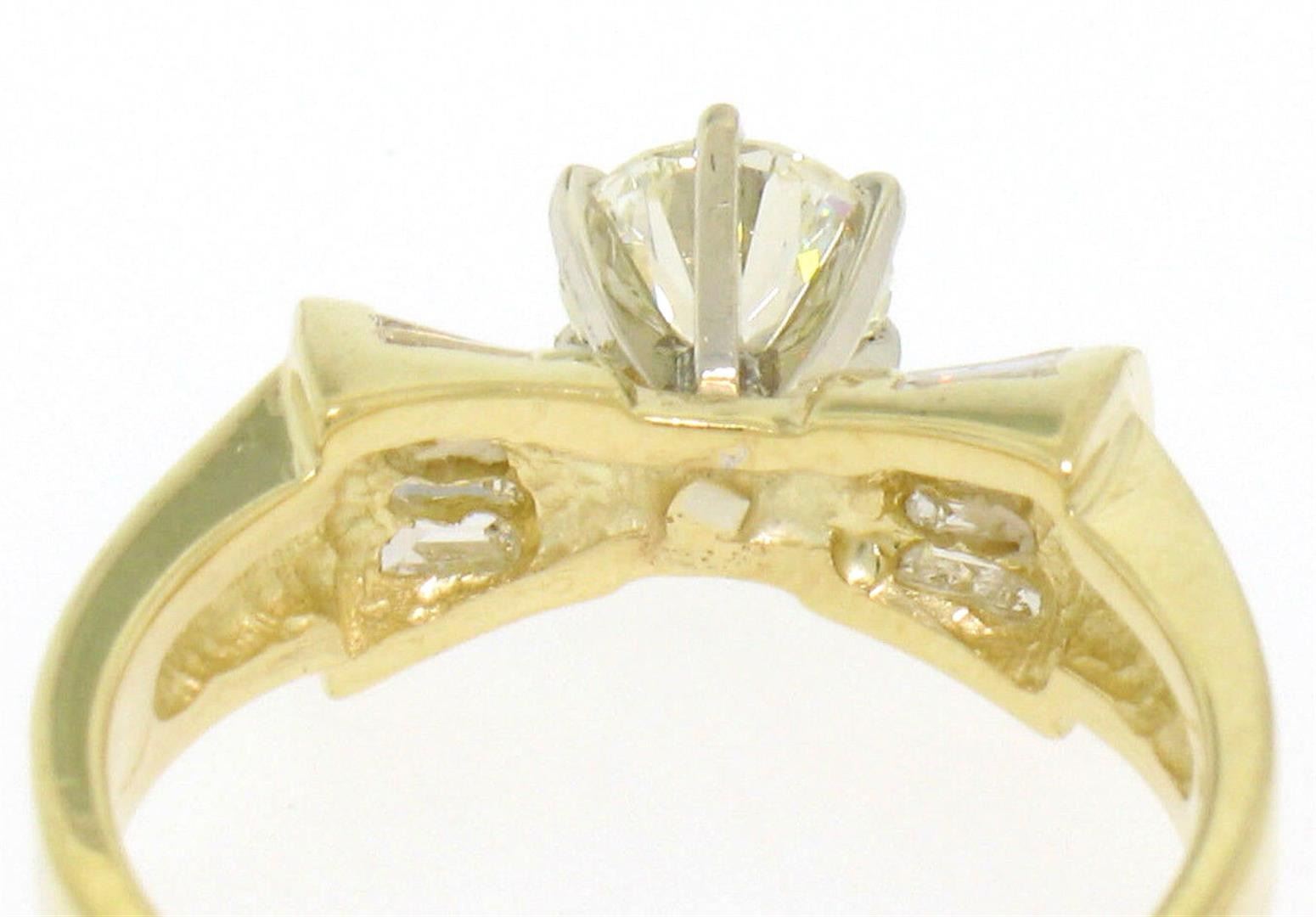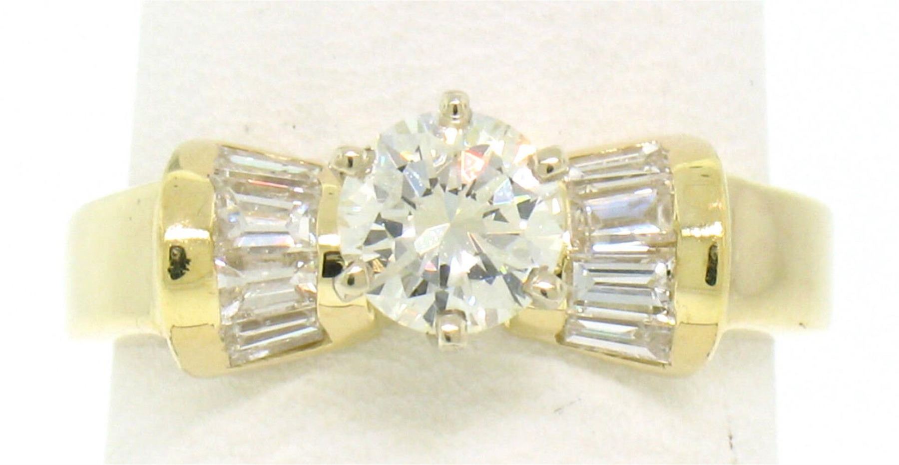 A new soldi 14k yellow gold solitaire ring, with 1 round brilliant cut natural diamond (G - VS1 ; 0.51ct), accented with 8 baguette cut natural diamonds (G - VS1 ; 0.40ctw). The ring is size 6.0, weighs a total of 3.9 grams, and measures 6.16mm wide.
