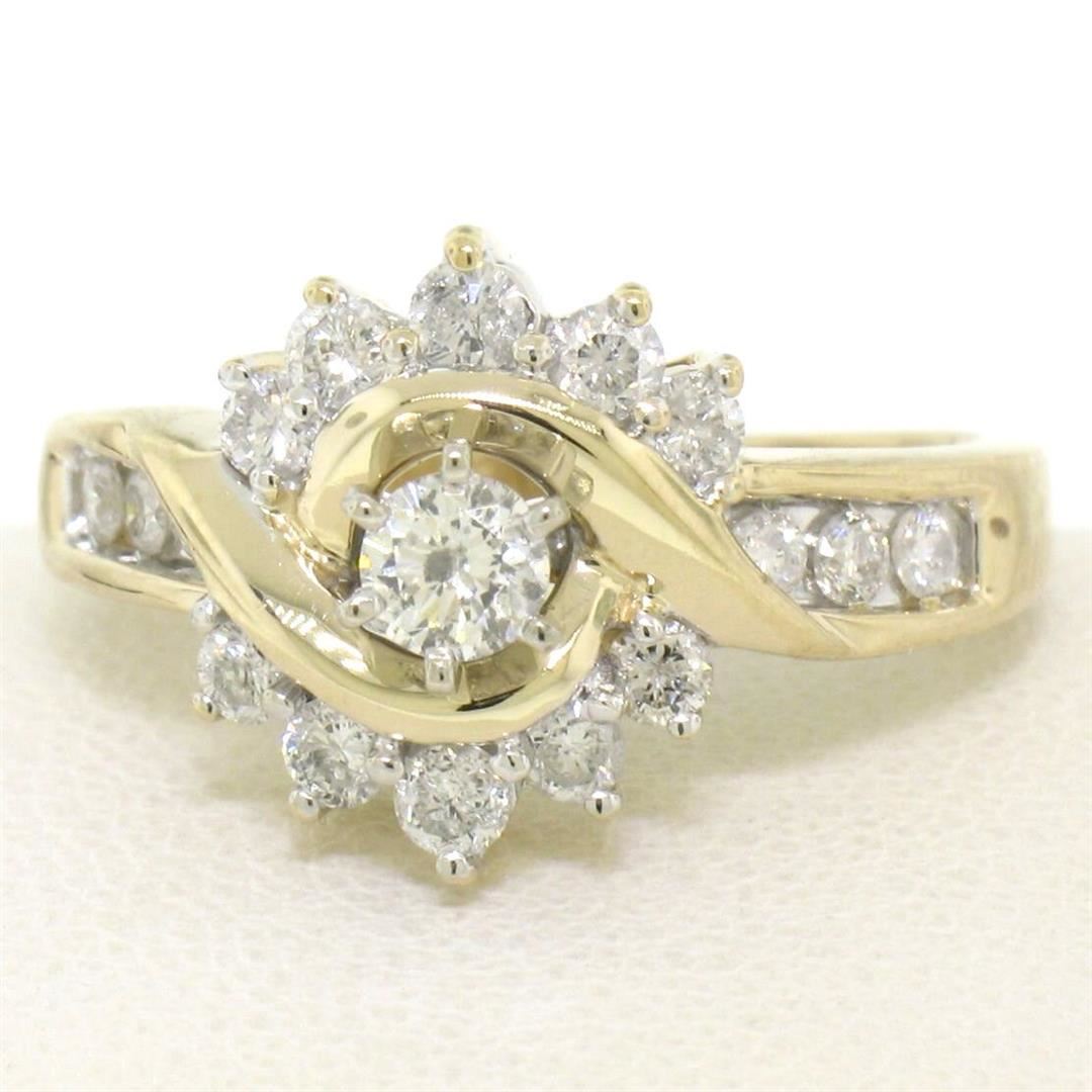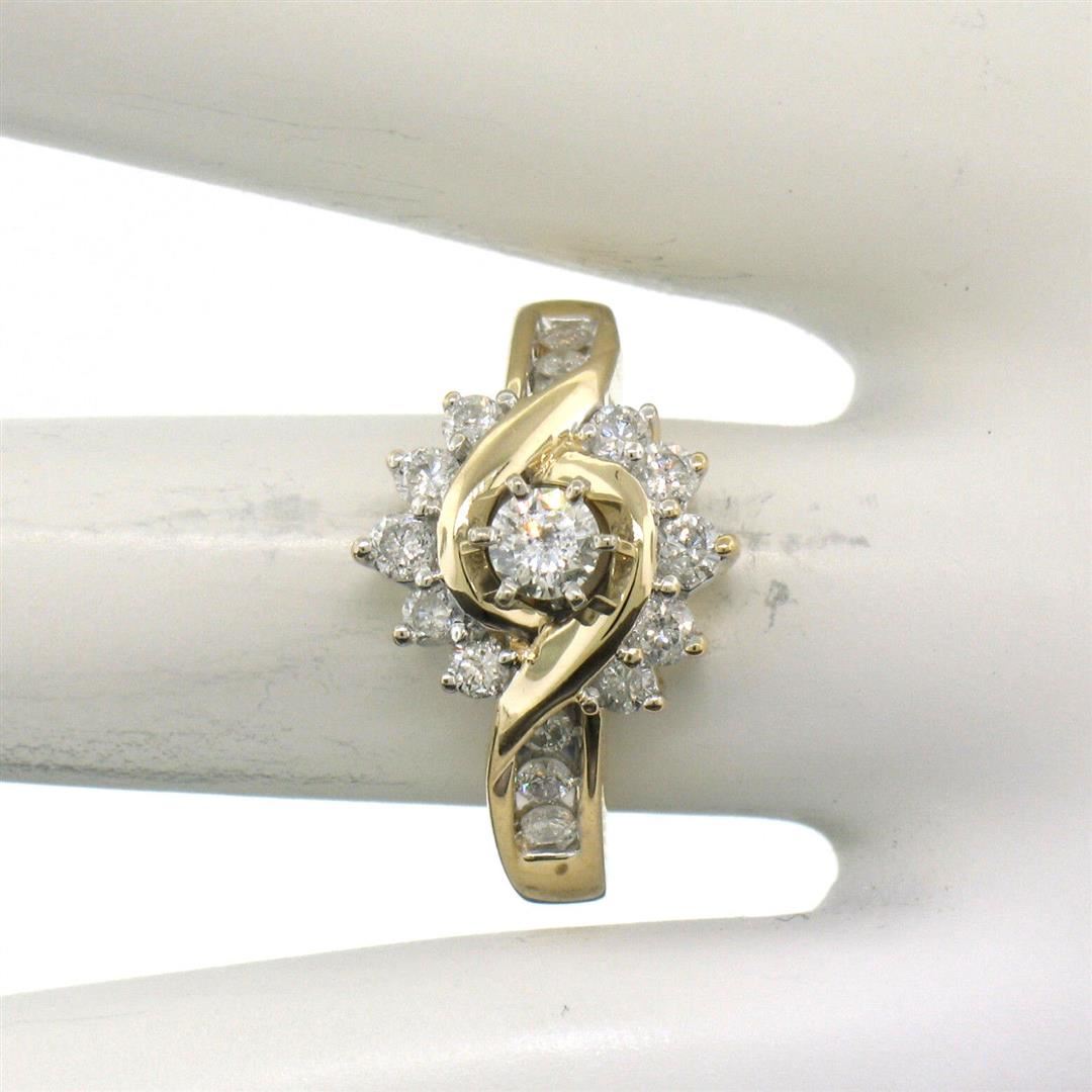 14k Yellow Gold 1.00ctw Keepsake Channel Round Diamond Cocktail Engagement Ring. Please see photos and description for all available information. An estate solid 14k yellow gold engagement ring by Keepsake, featuring 17 round brilliant cut natural diamonds (G - I1; 1.00ctw). The ring is size 7.0, weighs a total of 5.1 grams, and measures 13.0mm wide.