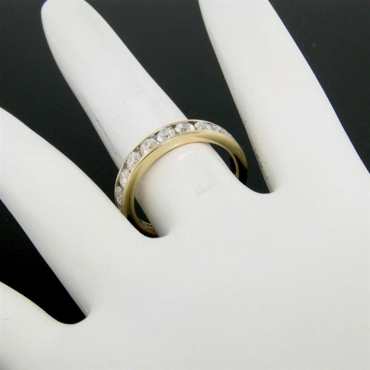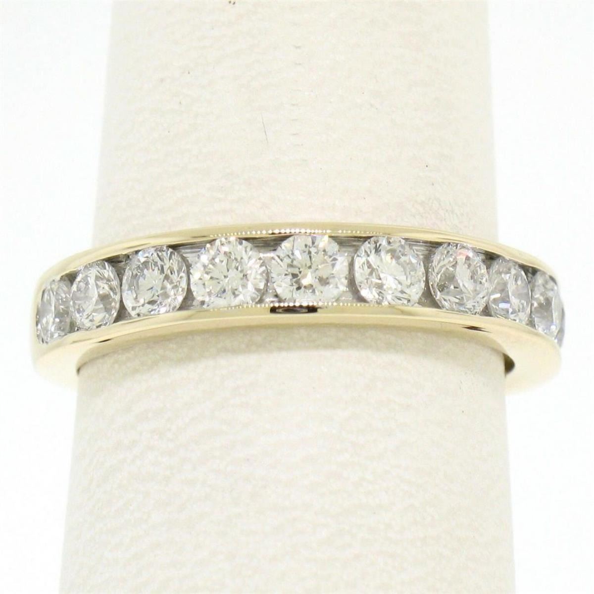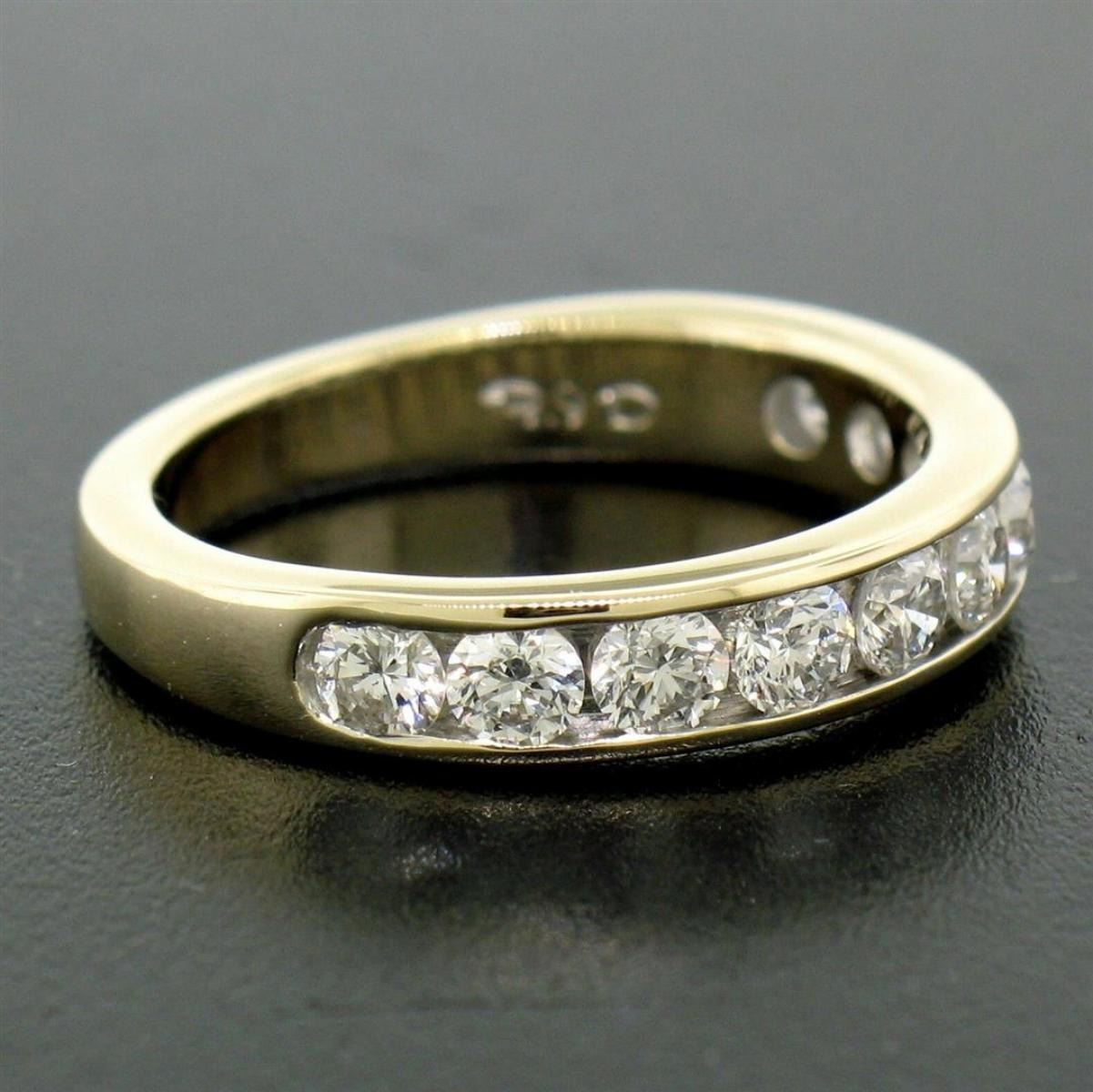 A like new 14kt yellow gold band ring channel set with 1.05ctw of round diamonds. The ring is size 6.25, weighs a total of 4.1 grams, and measures 4.0mm wide.
