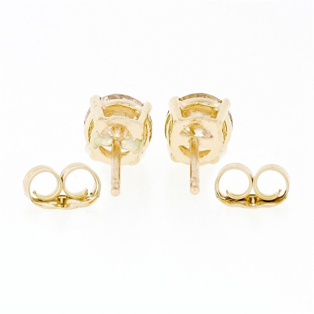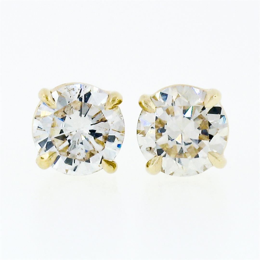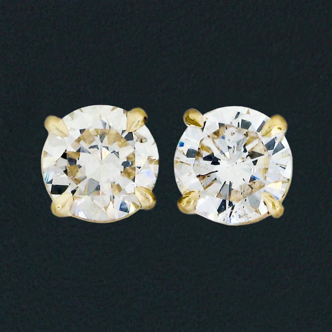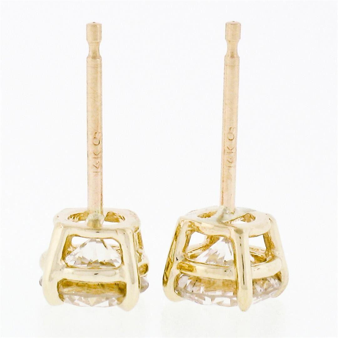 14k Yellow Gold 1.11ctw Round Brilliant Cut Diamond Claw Prong Stud Earrings. A brand new pair of classic solid 14k yellow gold stud earrings featuring a pair of claw prong set round brilliant cut natural diamonds (J - VS1/VS2; 1.11ctw). The earrings measure approximately 6.3mm in diameter and weigh a total of 1.03 grams.