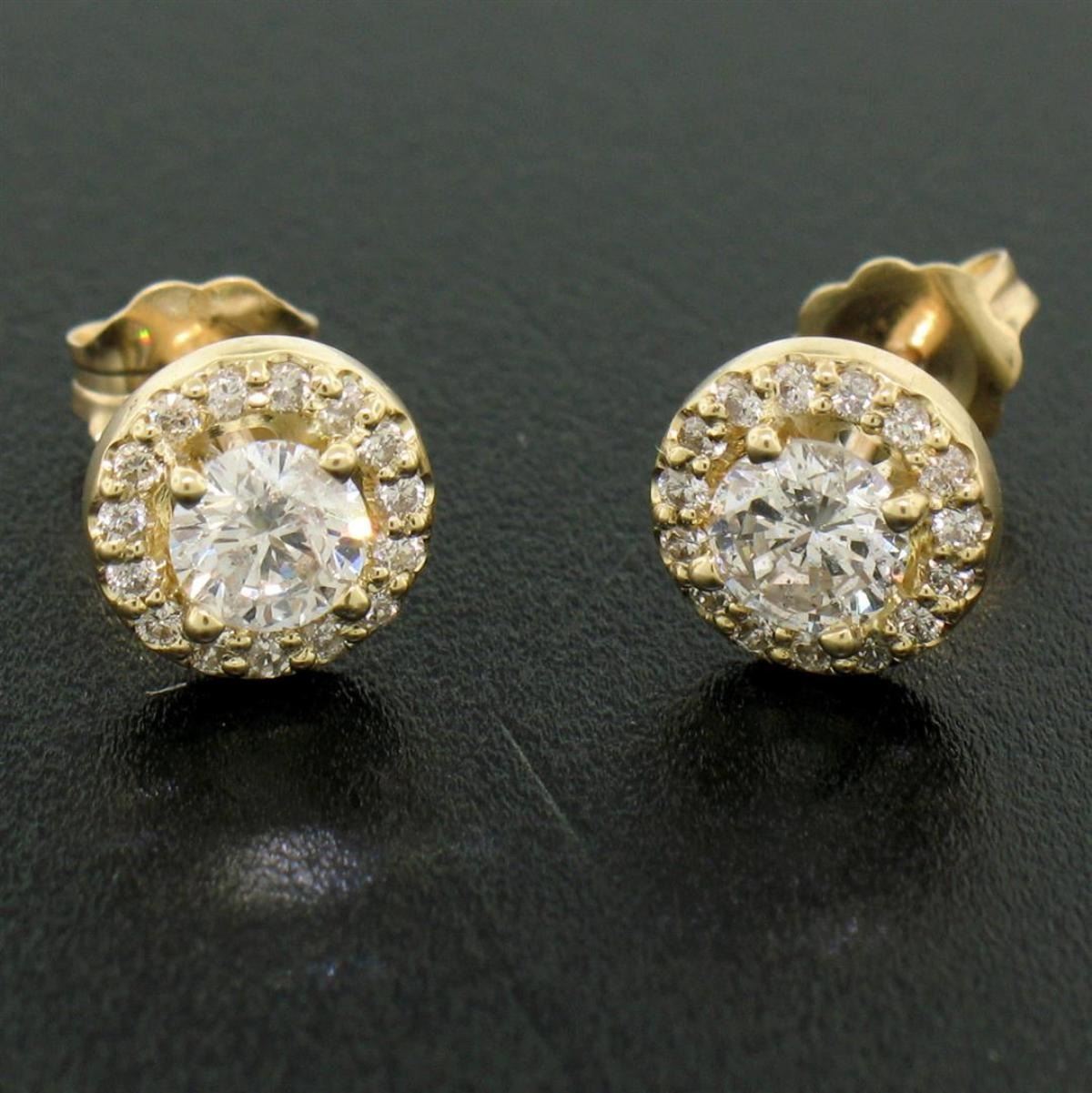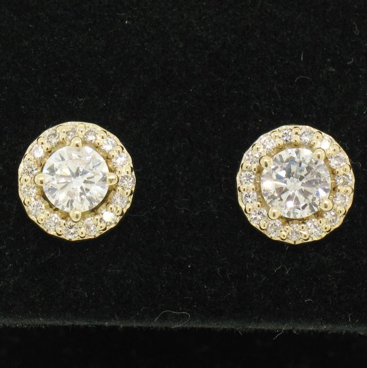 One NEW 14k Yellow Gold 1.12ctw Round Brilliant Diamond Stud Earrings w/ Pave Halos. Item Details: Material: 14k Solid Yellow Gold, Weight: 2.2 Grams, Stone(s): (2) Natural Genuine Diamonds - Round Brilliant Cut - Prong Set - SI2/I1 Clarity - G Color - 0.81ctw (approx.), (30) Natural Genuine Diamonds - Round Brilliant Cut - Prong Set - VS2/SI1 Clarity - G/H Color - 0.30ctw (approx.), Total Carat Weight: 1.12 (approx.), Backing: Post Back w/ Butterfly Closure, Diameter: 8.17mm, Thickness: 3.37mm projection off the ear, Condition: New w/o Tag