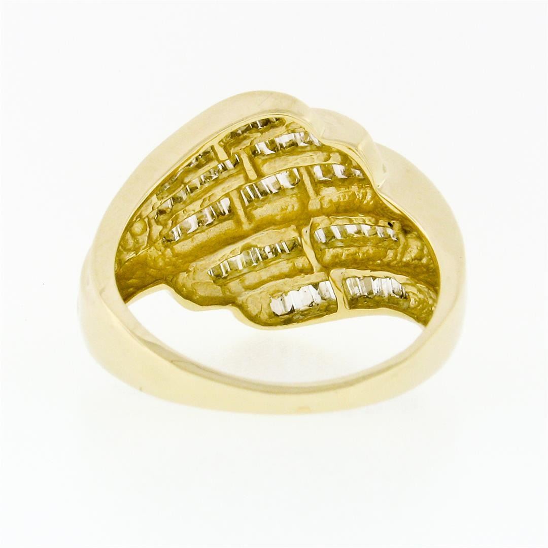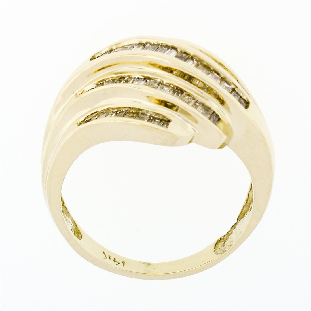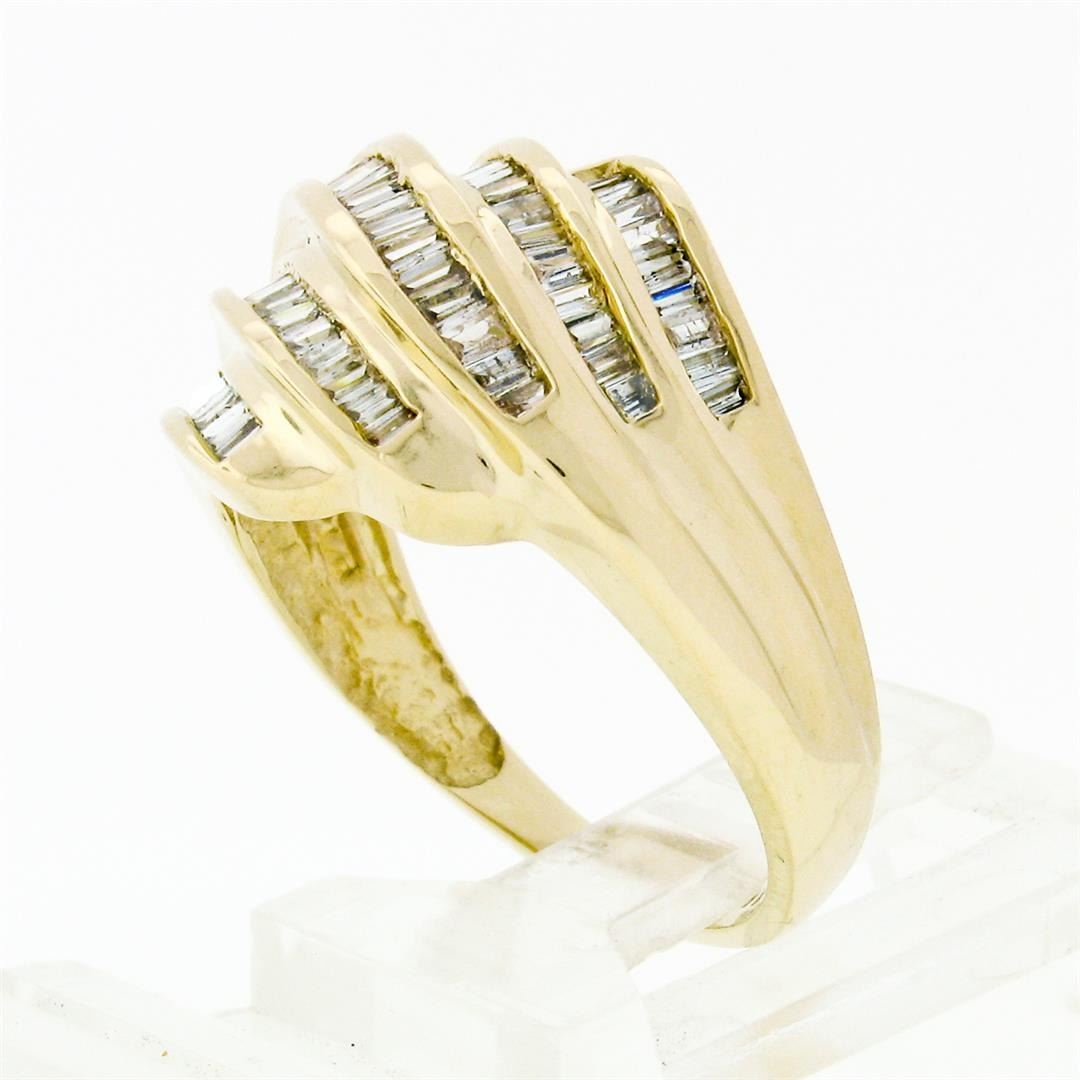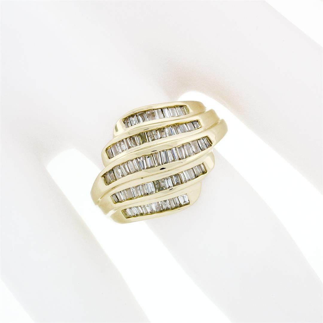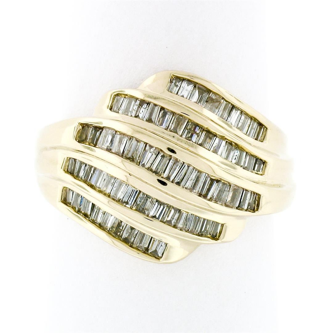 A solid 14k yellow gold band ring, with 60 straight and tapered baguette cut natural diamonds (H/I - SI1 to I1 ; 1.15ctq). The ring is size 7.0 weighs a total of 5.26 grams, and measures 14.80mm wide.
