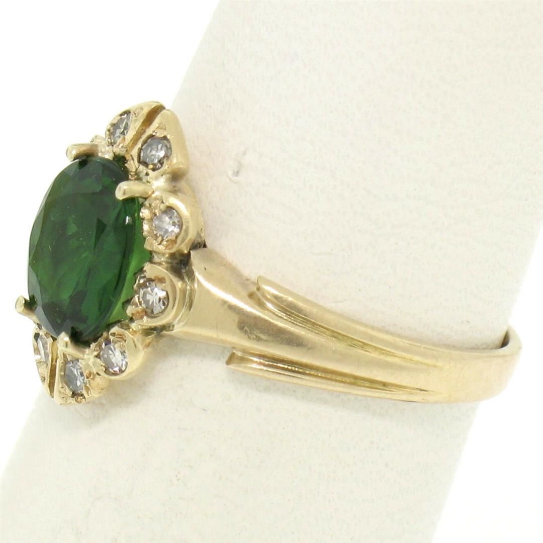 One Vintage 14k Yellow Gold 1.15ctw Green Tourmaline Solitaire & Diamond Halo Ring. Item Details - Material: 14K Solid Yellow Gold, Weight: 2.7 Grams, Stone(s): (1) Natural Genuine Tourmaline - Oval Cut - Prong Set - Green Color - 1.00ct (approx.), ** Absolute TOP QUALITY Stone! **, (10) Natural Genuine Diamonds - Single Cut - Bead Set - H Color - SI1 Clarity - 0.15ctw (approx.), Total Carat Weight: 1.15 (approx.), Ring Size: 5.5, Ring Width: 12.5mm, Ring Height: 4.0mm rise off the finger, Condition: Original patina has been preserved. Excellent, ready to wear condition!