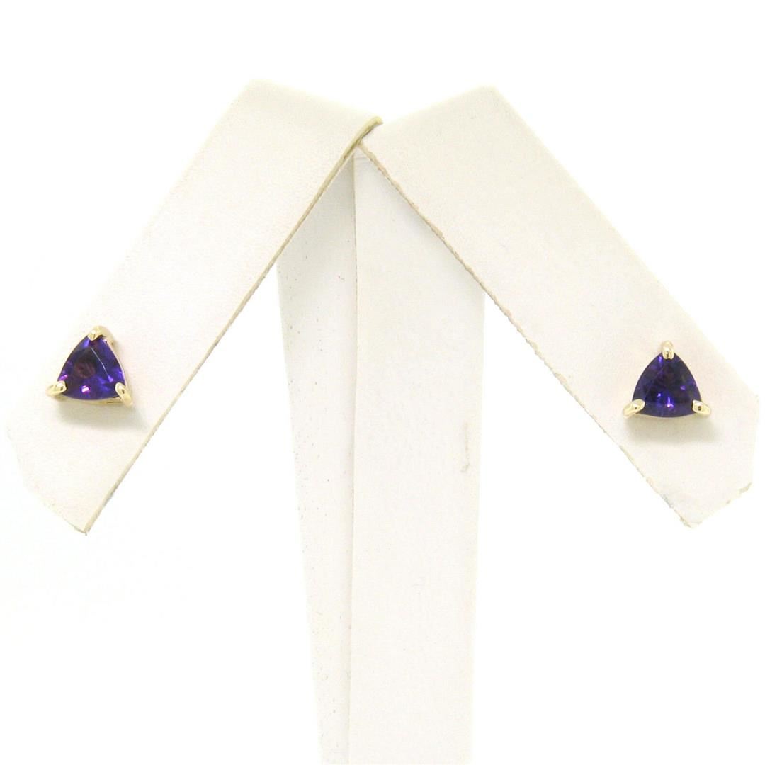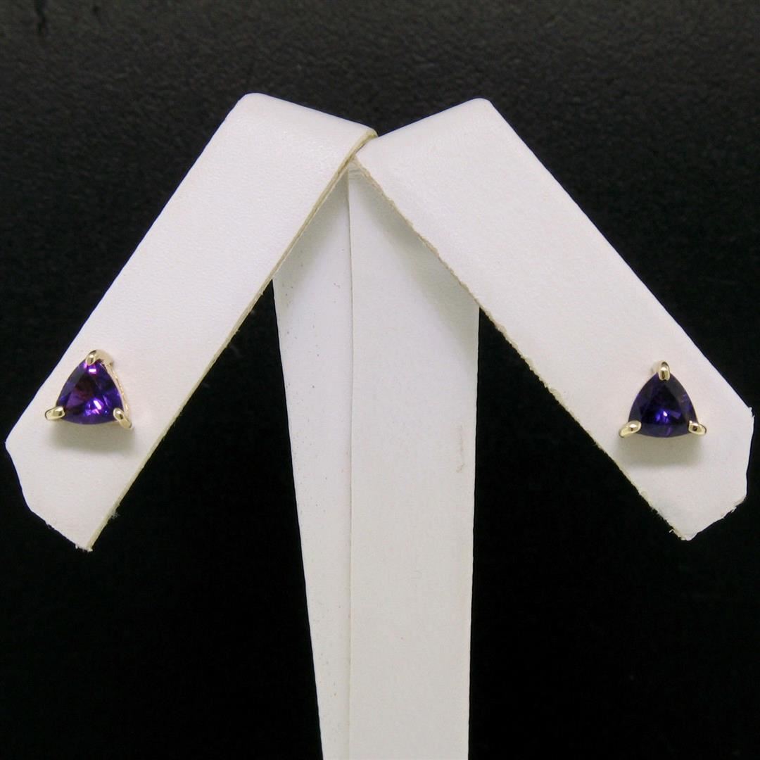 One 14k Yellow Gold 1.20ctw Prong Set Trillion Cut Amethyst Solitaire Stud Earrings. Item Details: Material: 14k Solid Yellow Gold, Weight: 1.3 Grams, Stone(s): (2) Natural Genuine Amethyst - Trillion Cut - Prong Set - Rich Royal Purple Color - 1.20ctw (approx.), Backing: Post Backings w/ Butterfly Fastenings (Pierced ears are required.), Width: 5.9mm, Height: 5.9mm, Thickness: 5.4mm, Condition: Like New!