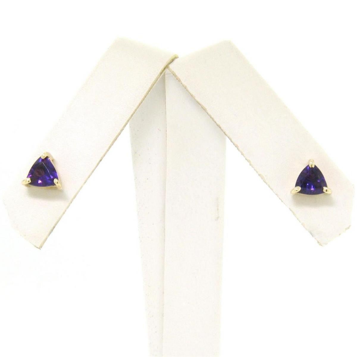 One 14k Yellow Gold 1.20ctw Prong Set Trillion Cut Amethyst Solitaire Stud Earrings. Item Details: Material: 14k Solid Yellow Gold, Weight: 1.3 Grams, Stone(s): (2) Natural Genuine Amethyst - Trillion Cut - Prong Set - Rich Royal Purple Color - 1.20ctw (approx.), Backing: Post Backings w/ Butterfly Fastenings (Pierced ears are required.), Width: 5.9mm, Height: 5.9mm, Thickness: 5.4mm, Condition: Like New!