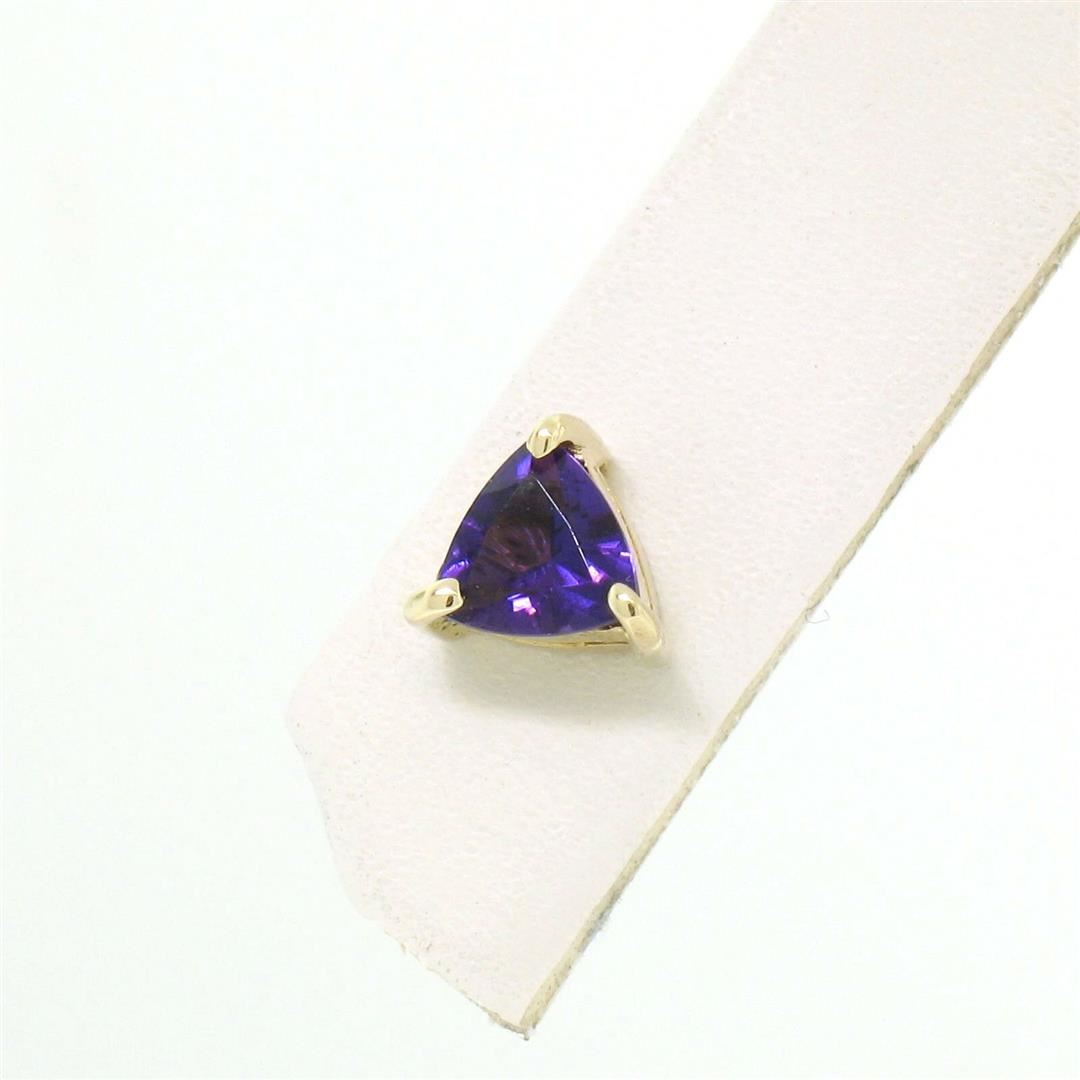 One Pair 14k Yellow Gold 1.20 ctw Prong Set Trillion Cut Amethyst Solitaire Stud Earrings. Item Details: Material:  14k Solid Yellow Gold, Weight:  1.3 Grams, Stone(s):  (2) Natural Genuine Amethyst - Trillion Cut - Prong Set - Rich Royal Purple Color - 1.20 ctw (approx.), Backing:  Post Backings w/ Butterfly Fastenings (Pierced ears are required.), Width:  5.9mm, Height:  5.9mm, Thickness:  5.4mm, Condition:  Like New!
