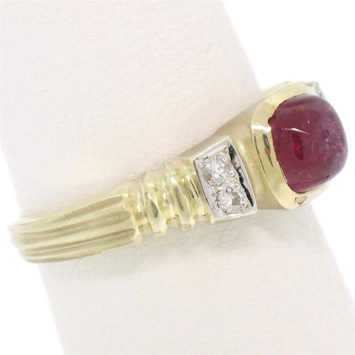 One Estate 14k Yellow Gold 1.21ctw Cabochon Ruby Solitaire Ring w/ 4 Diamond Accents. Item Details - Material: 14k Solid Yellow Gold, Weight: 4.9 Grams, Stone(s): (1) Natural Genuine Ruby - Cushion Cabochon Cut - Bezel Set - Bloody Red Color - 1.15ct (approx.), (4) Natural Genuine Diamonds - Round Brilliant Cut - Prong Set - G/H Color - VS2 Clarity - 0.06ctw (approx.), Total Carat Weight: 1.21 (approx.), Ring Size: 7.5, Ring Width: 7.45mm, Ring Height: 7.22mm rise off the finger, Condition: Estate piece - Excellent condition!