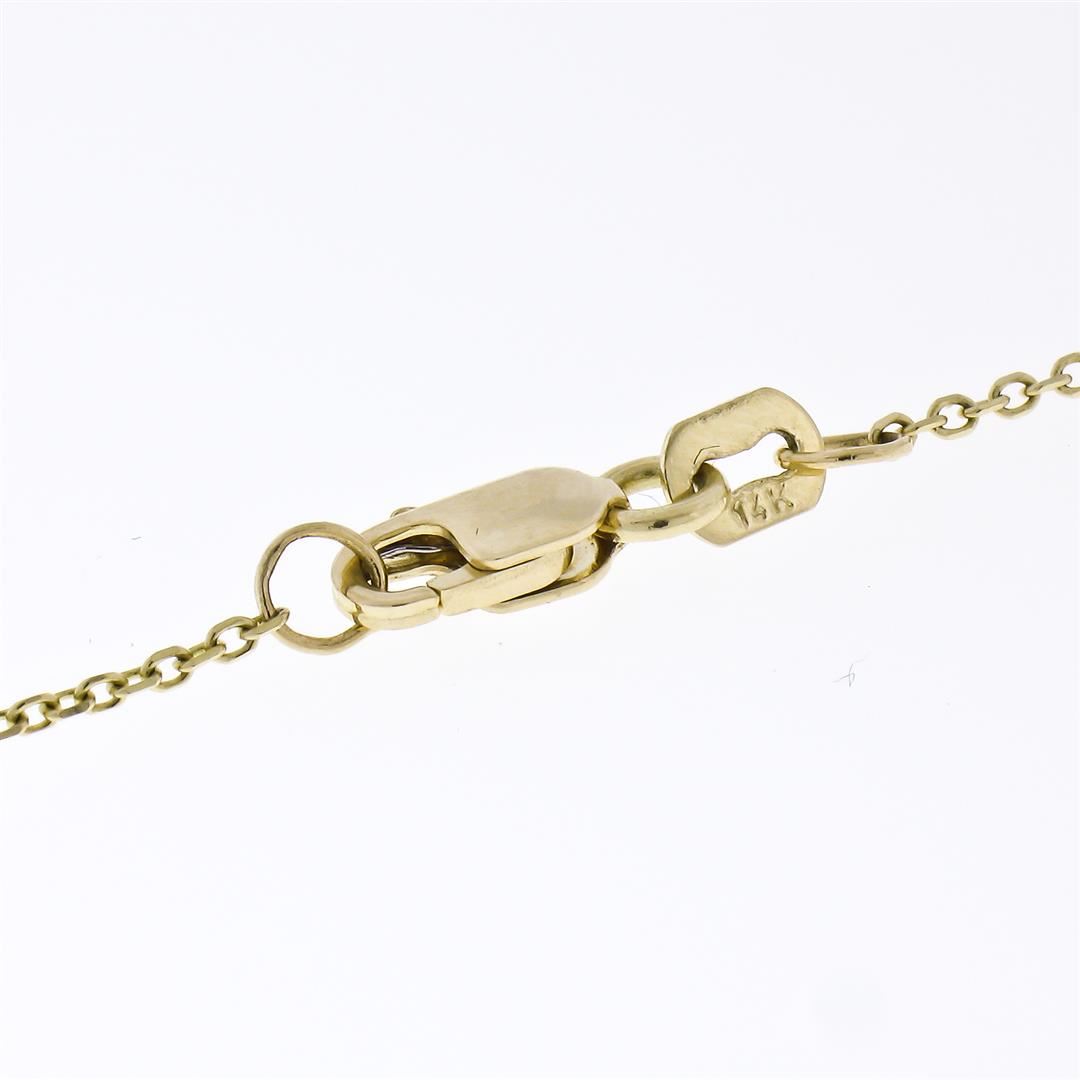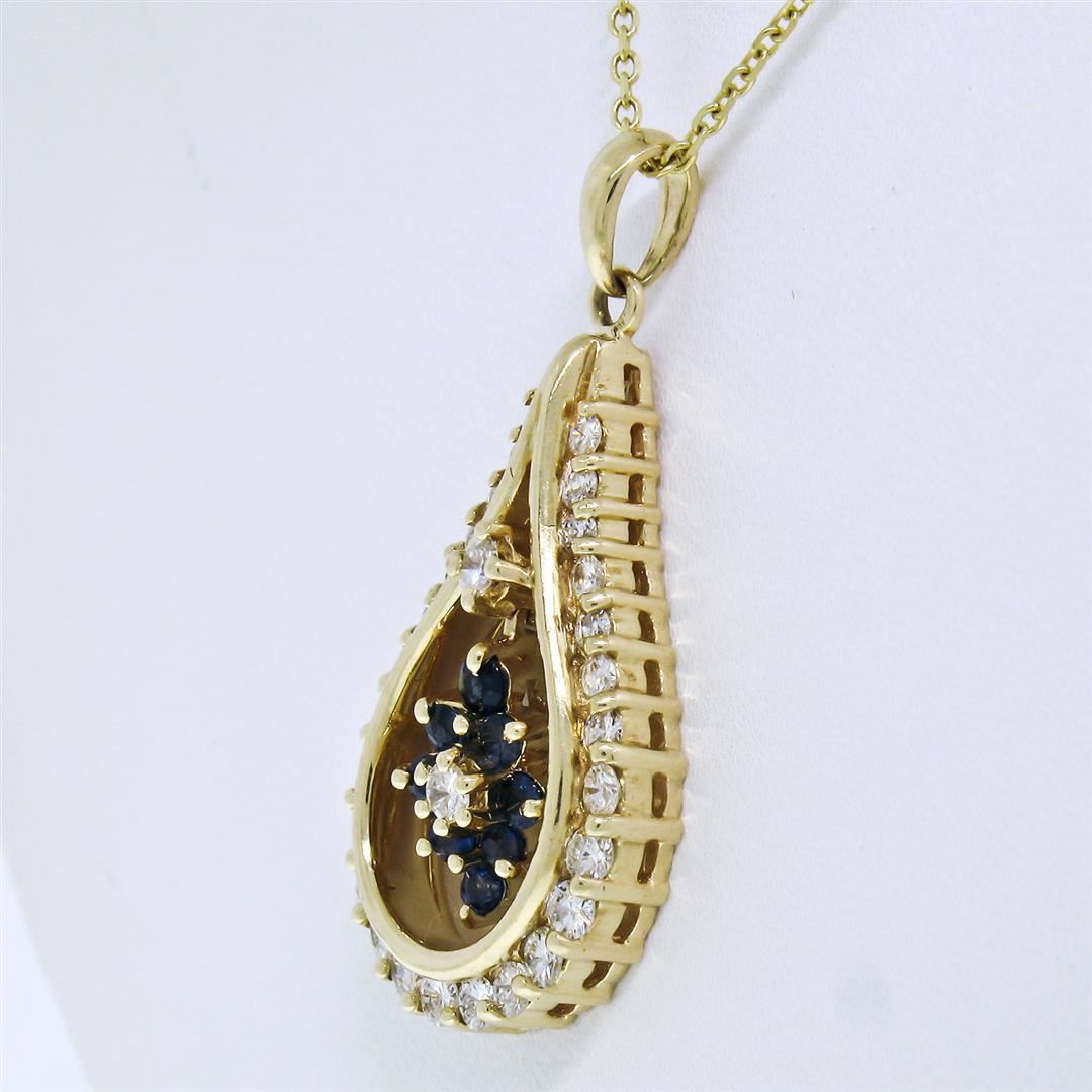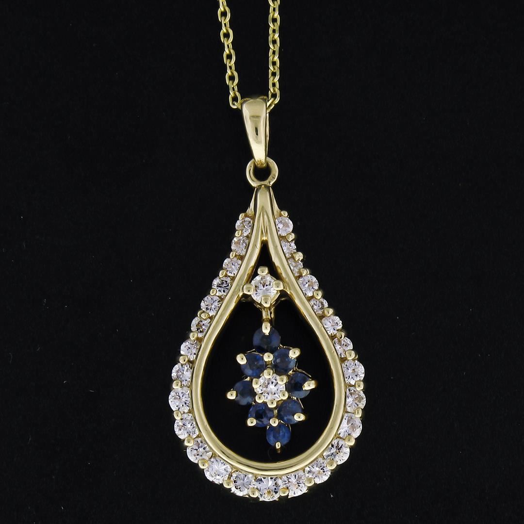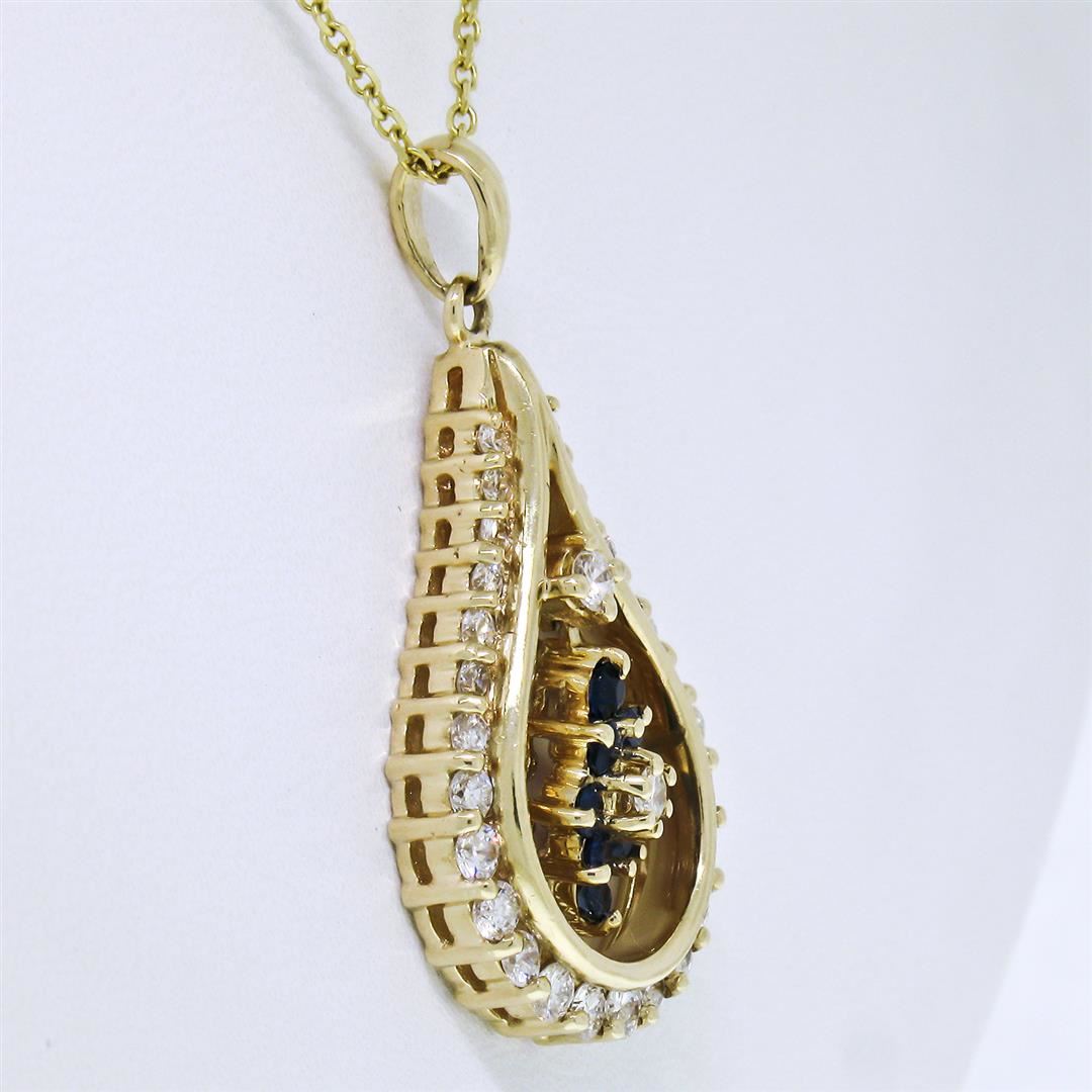 A like new 14k yellow gold tear drop pendant set with 0.32ctw of round sapphires and 0.90ctw of round diamonds (F/G - VS1/VS2). With 20 inch cable link chain, 7.13 grams total weight, measures 28.25x15.70mm.