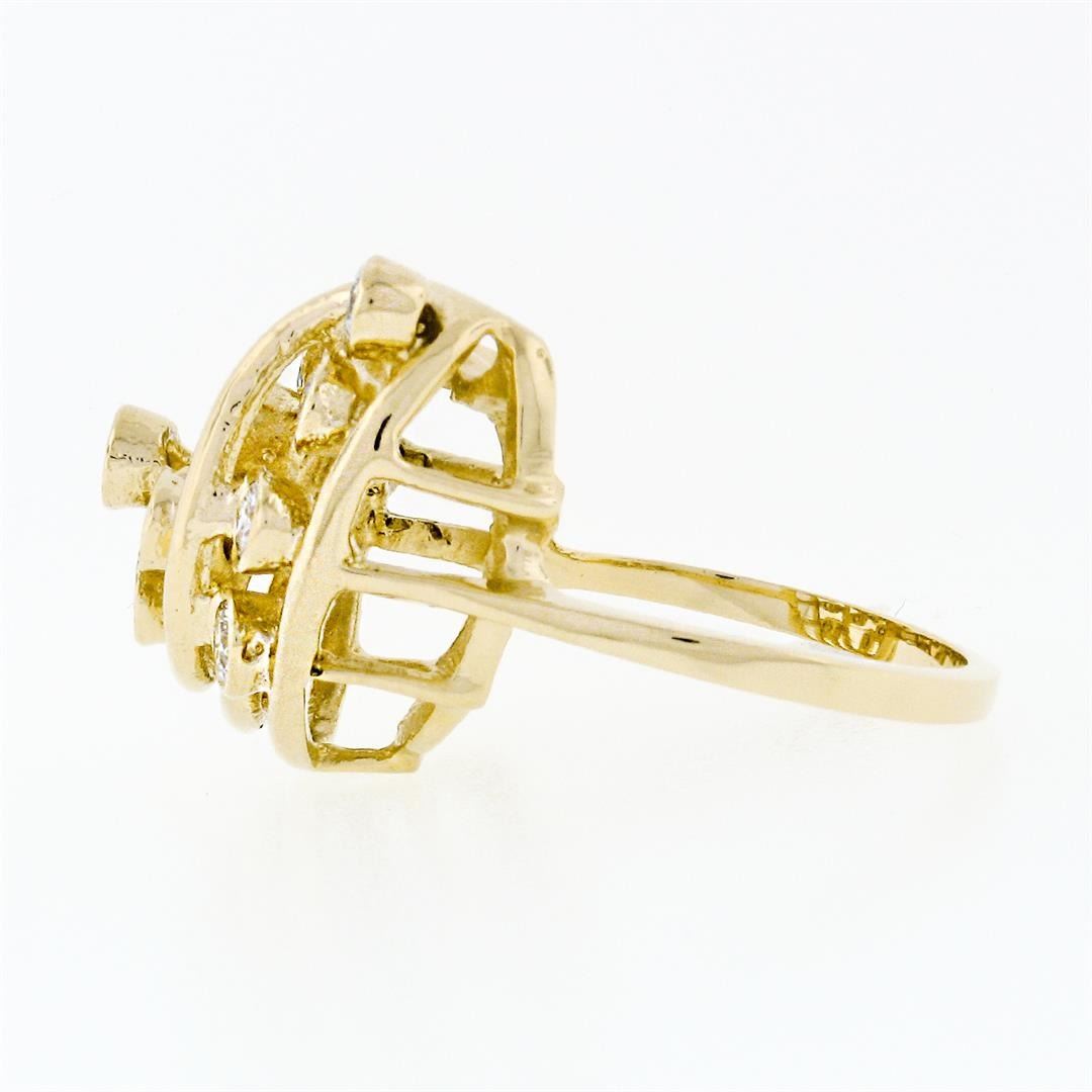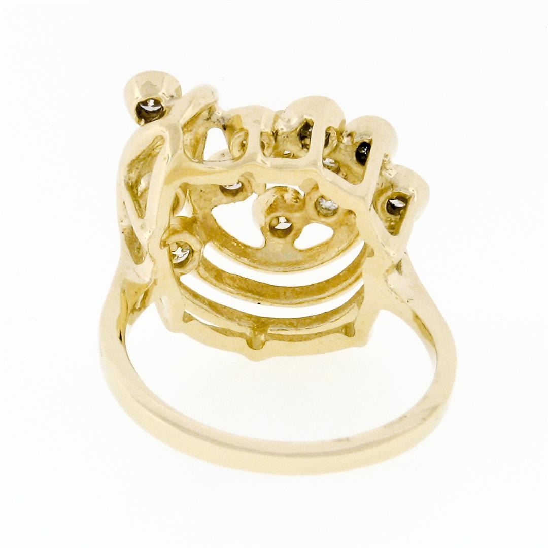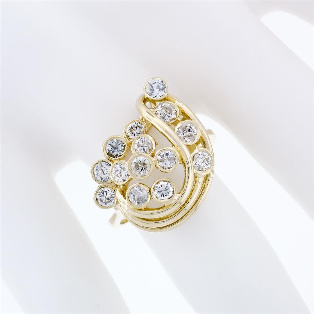 An estate solid 14k yellow gold cocktail ring, with 14 round brilliant cut natural diamonds (G/H- SI2/I1 ; 1.30 ctw). The ring is size 6.5, weighs a total of 5.93 grams, and measures 18.20mm wide.