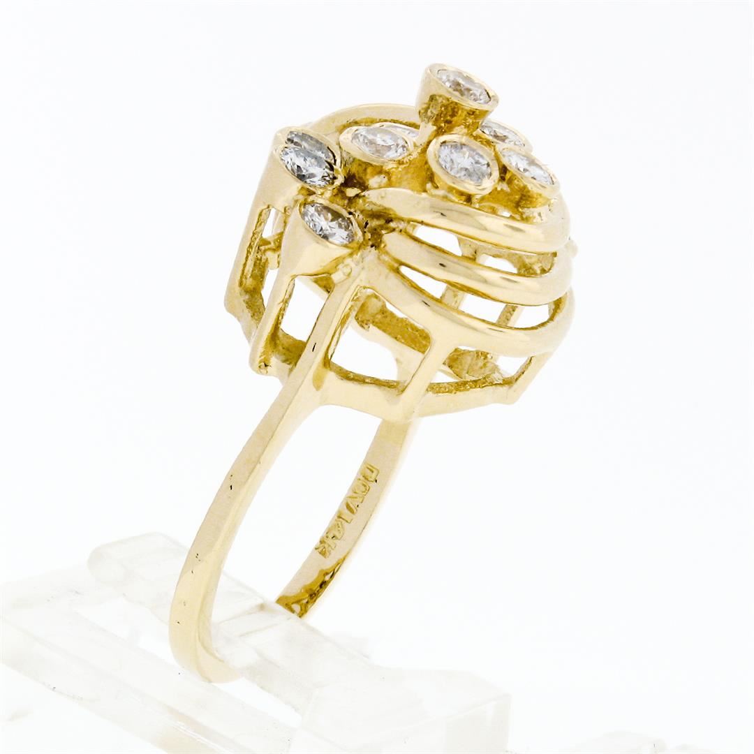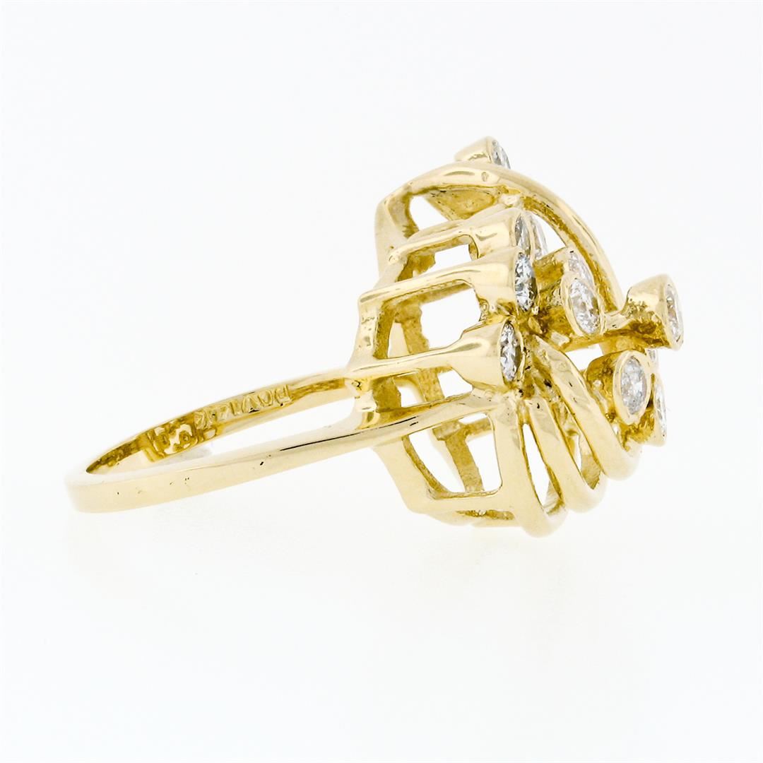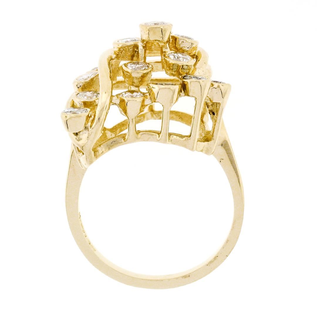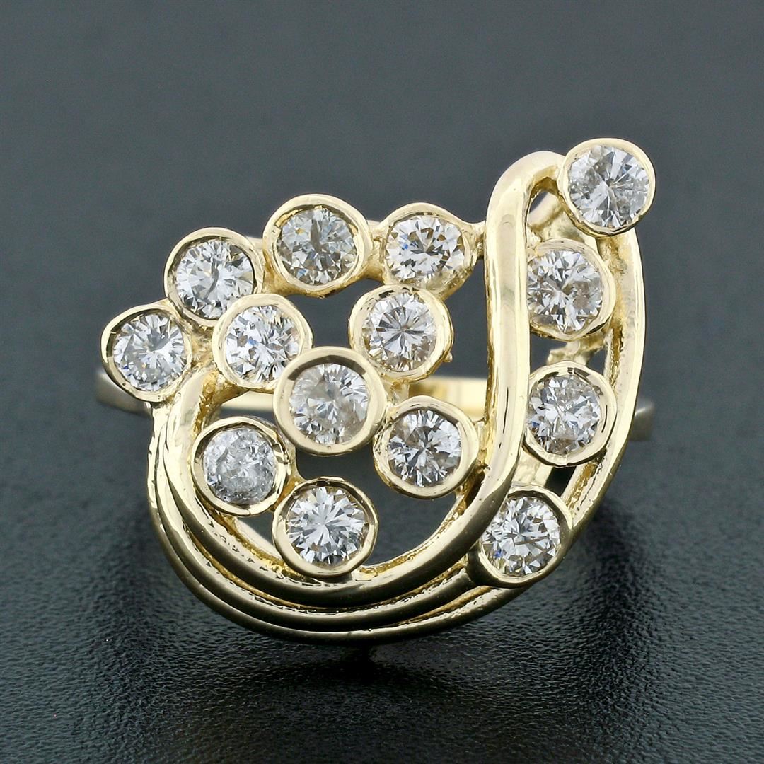 An estate solid 14k yellow gold cocktail ring, with 14 round brilliant cut natural diamonds (G/H- SI2/I1 ; 1.30 ctw). The ring is size 6.5, weighs a total of 5.93 grams, and measures 18.20mm wide.