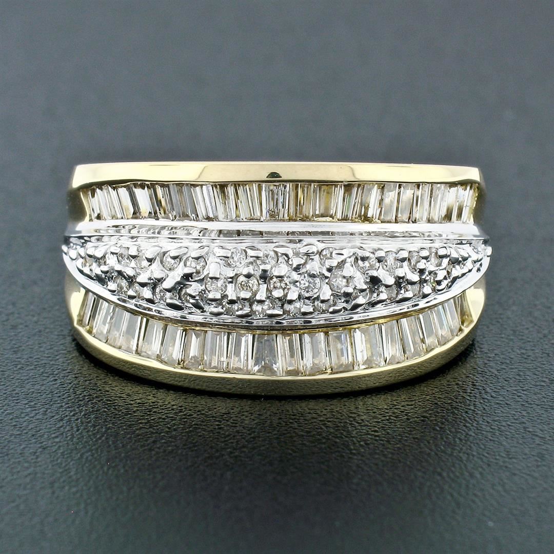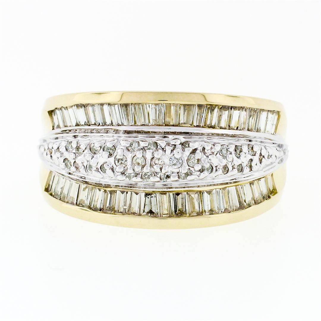 A solid 14k yellow gold 3 row band ring with 34 round brilliant cut natural diamonds (H/I - SI1 to I1; 0.34ctw) and 44 tapered baguette cut natural diamonds (H/I - SI1 to I1; 1.00ctw). The ring is size 7.0 weighs a total of 7.30 grams, and measures 11.53mm wide.