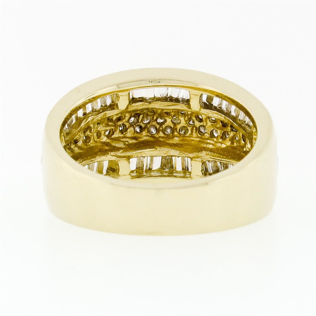 A solid 14k yellow gold 3 row band ring with 34 round brilliant cut natural diamonds (H/I - SI1 to I1; 0.34ctw) and 44 tapered baguette cut natural diamonds (H/I - SI1 to I1; 1.00ctw). The ring is size 7.0 weighs a total of 7.30 grams, and measures 11.53mm wide.