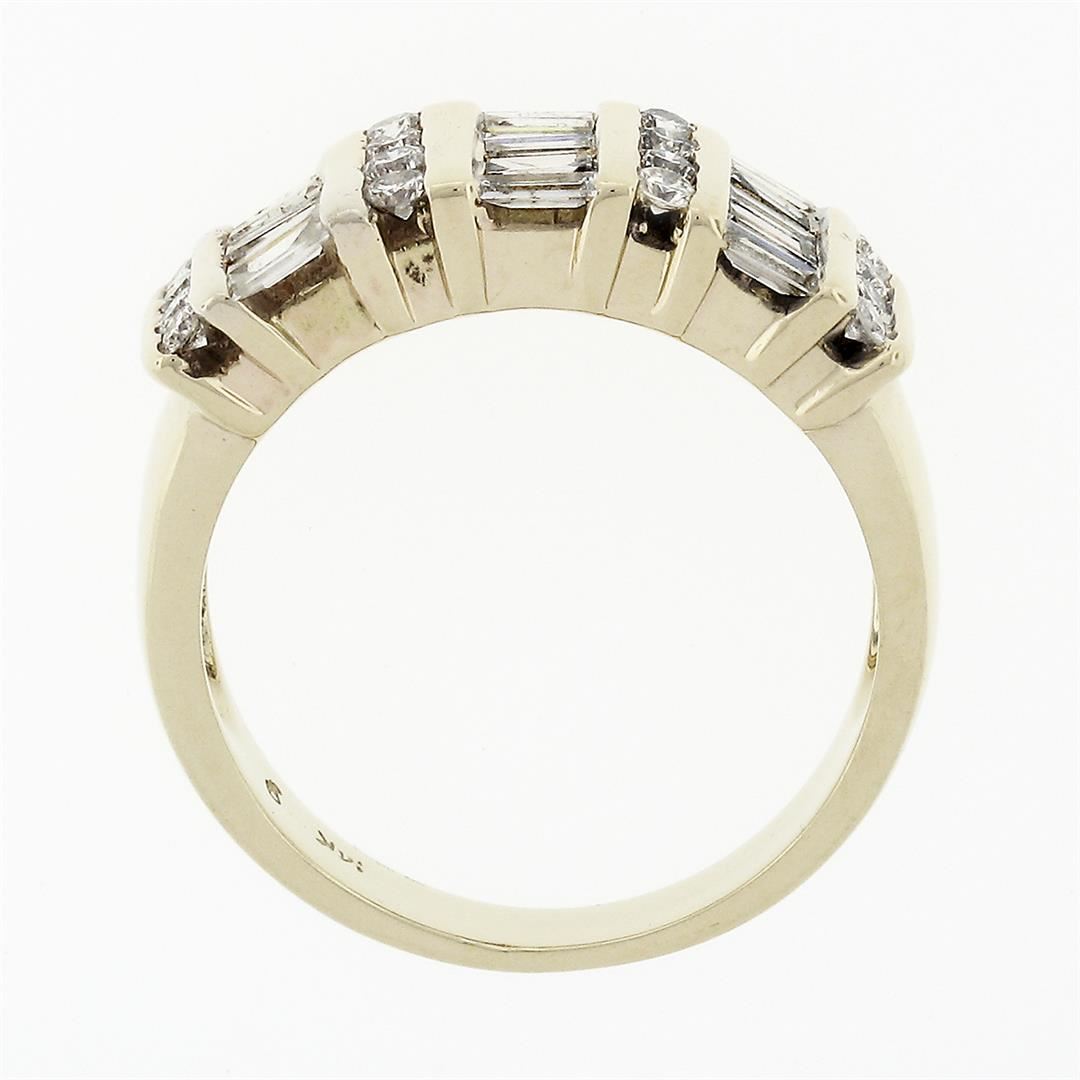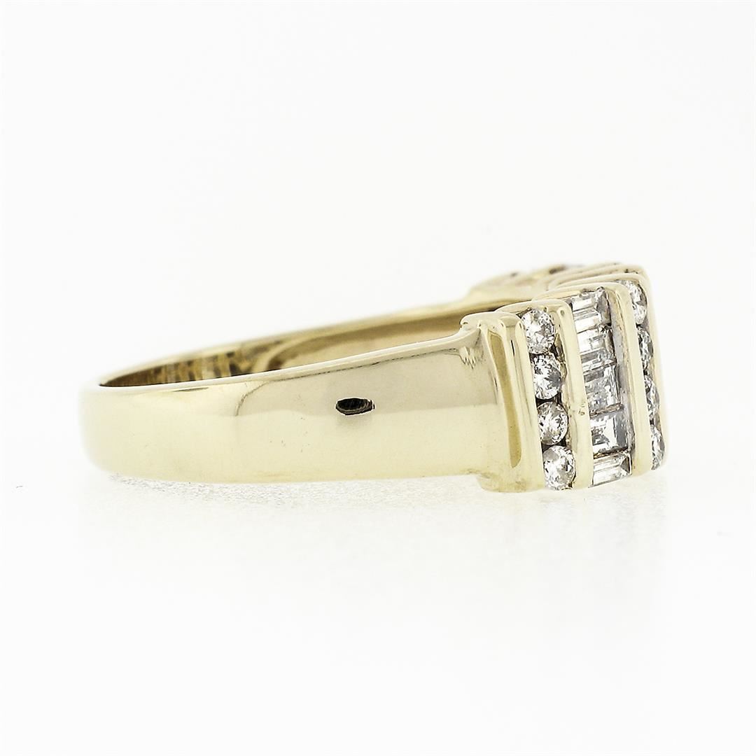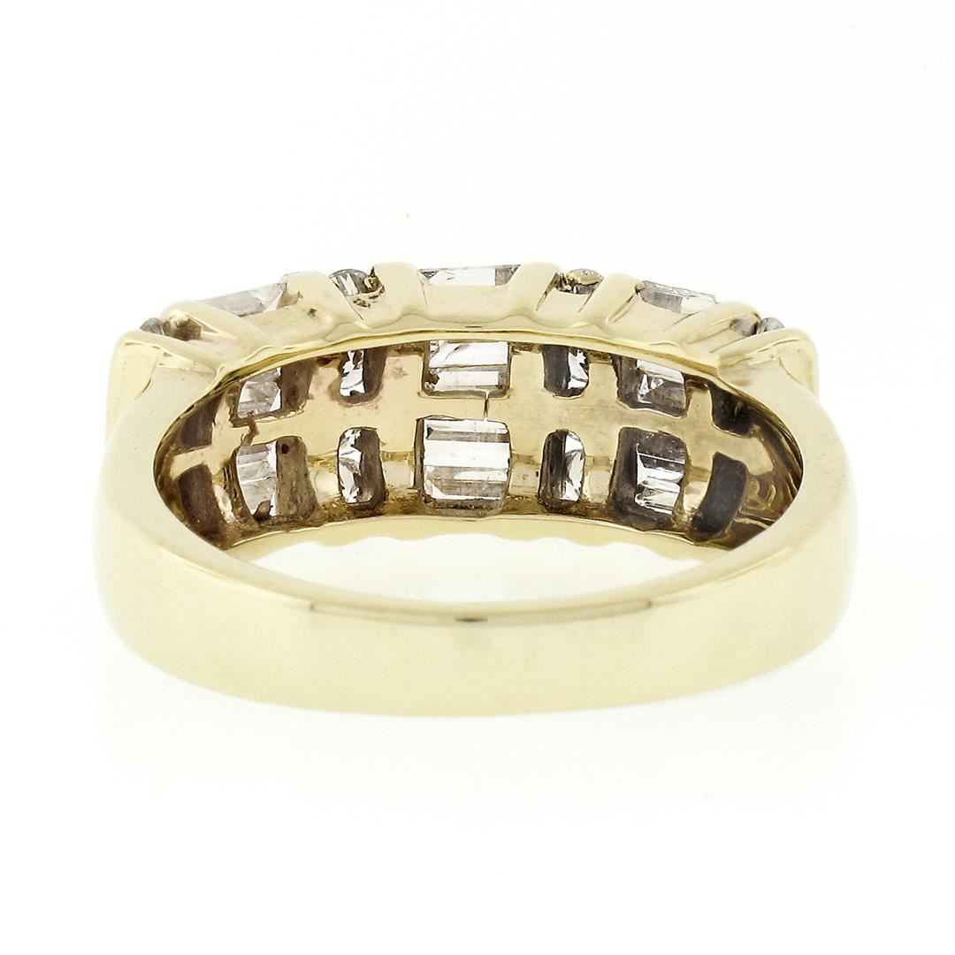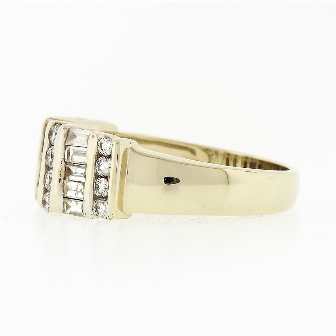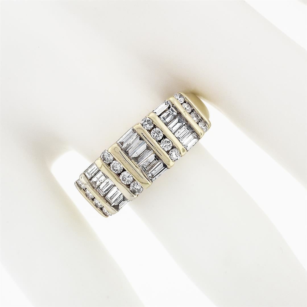 A solid 14k yellow gold band ring, with 16 round brilliant cut natural diamonds (F/G - SI1/SI2 ; 0.32ctw), and 15 baguette cut natural diamonds (F/G - SI1/SI2 ; 1.05ctw). The ring is size 7.5, weighs a total of 5.80 grams, and measures 7.77mm wide.