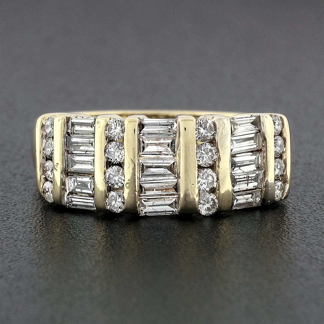 A solid 14k yellow gold band ring, with 16 round brilliant cut natural diamonds (F/G - SI1/SI2 ; 0.32ctw), and 15 baguette cut natural diamonds (F/G - SI1/SI2 ; 1.05ctw). The ring is size 7.5, weighs a total of 5.80 grams, and measures 7.77mm wide.