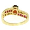 A 14k yellow gold ring featuring a 1.00ct oval cut garnet, 0.48ctw of princess cut rubies, and 0.10ctw of round brilliant diamonds. The ring is size 5.5, weighs a total of 3.3 grams, and measures 7.00mm wide.
