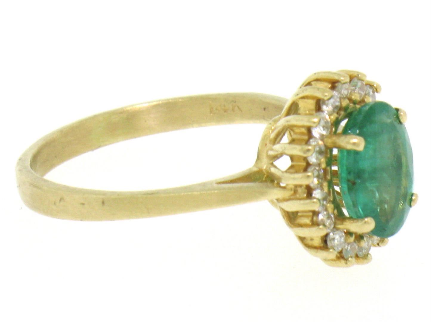 14k Yellow Gold 1.59ctw FINE Oval Emerald Solitaire & Round Diamond Halo Ring. Please see photos and description for all available information. An estate solid 14k yellow gold solitaire engagement ring, with 1 oval brilliant cut natural emerald (8.10x6.05mm - 1.32ct), surrounded with a halo of 18 round brilliant cut natural diamonds (G- VS2; 0.27ctw). The ring is size 6.0, weighs a total of 3.0 grams, and measures 9.75mm wide.