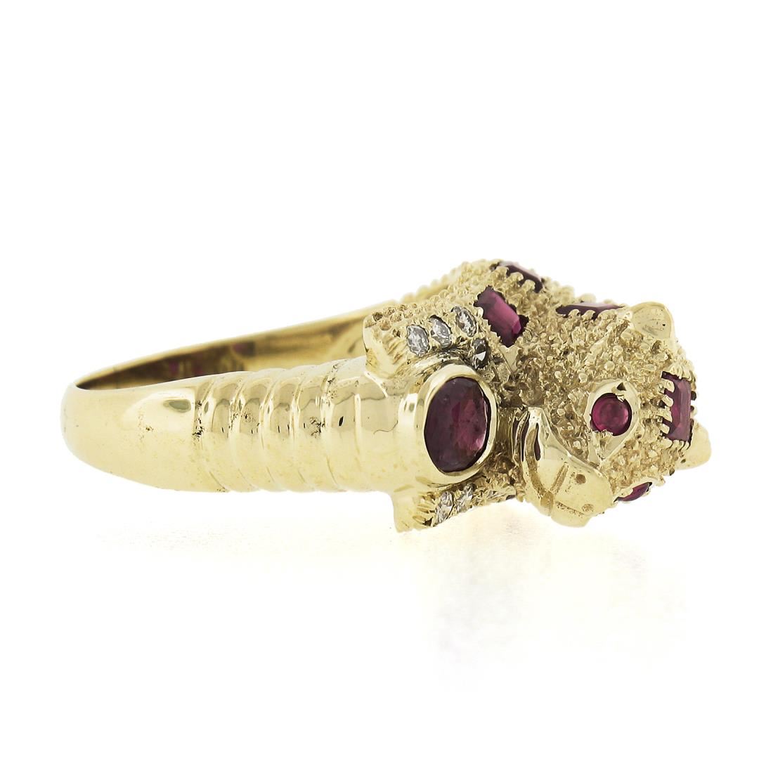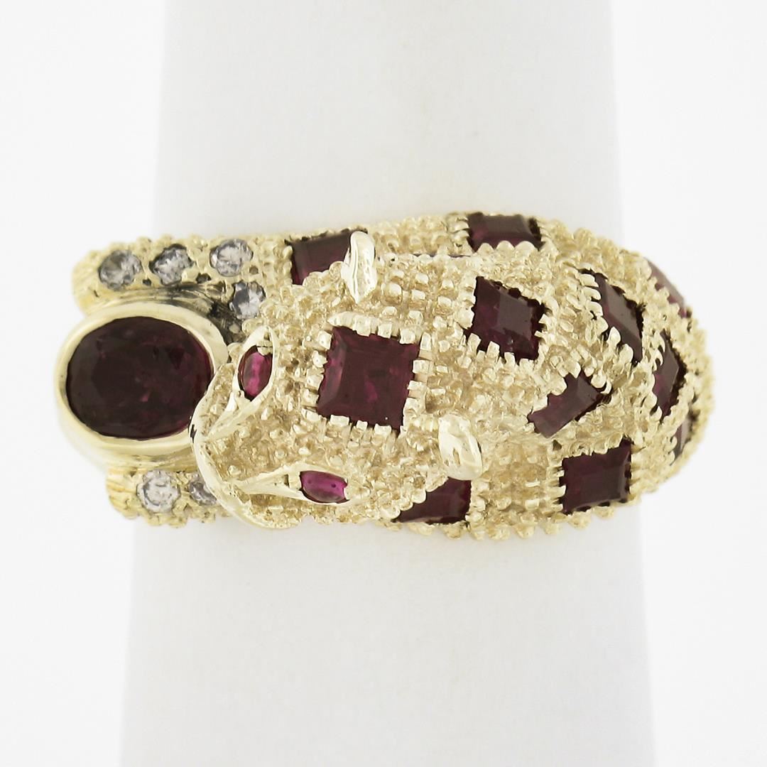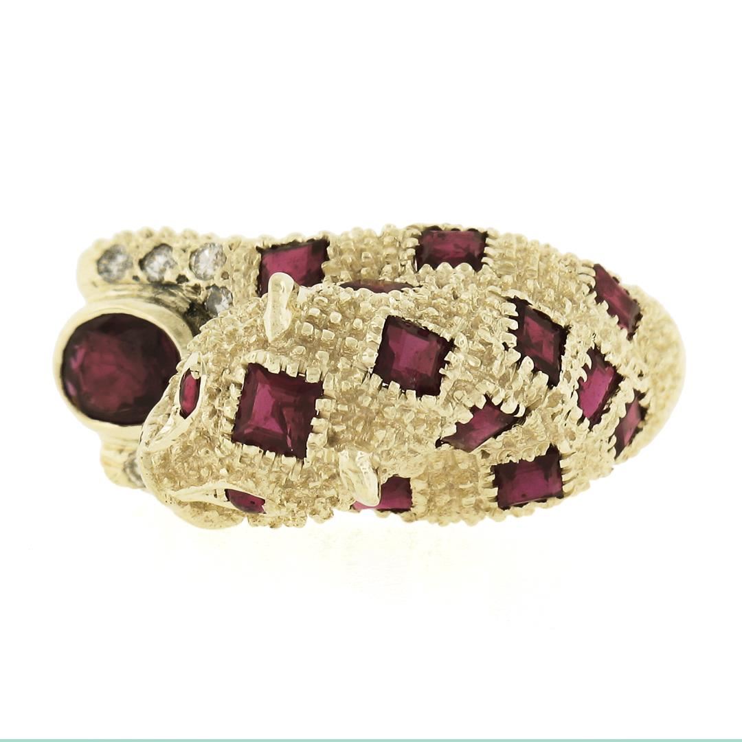A solid 14k yellow gold leopard ring, with 12 square cut, 2 round cabochon, 1 round cabochon cut natrual rubies (1.50ctw), and 8 round cut natural diamonds (F-H - VS1/VS2 ; 0.10ctw ). The ring is size 6.0, weighs a total of 7.43 grams, and measures 10.2mm wide.